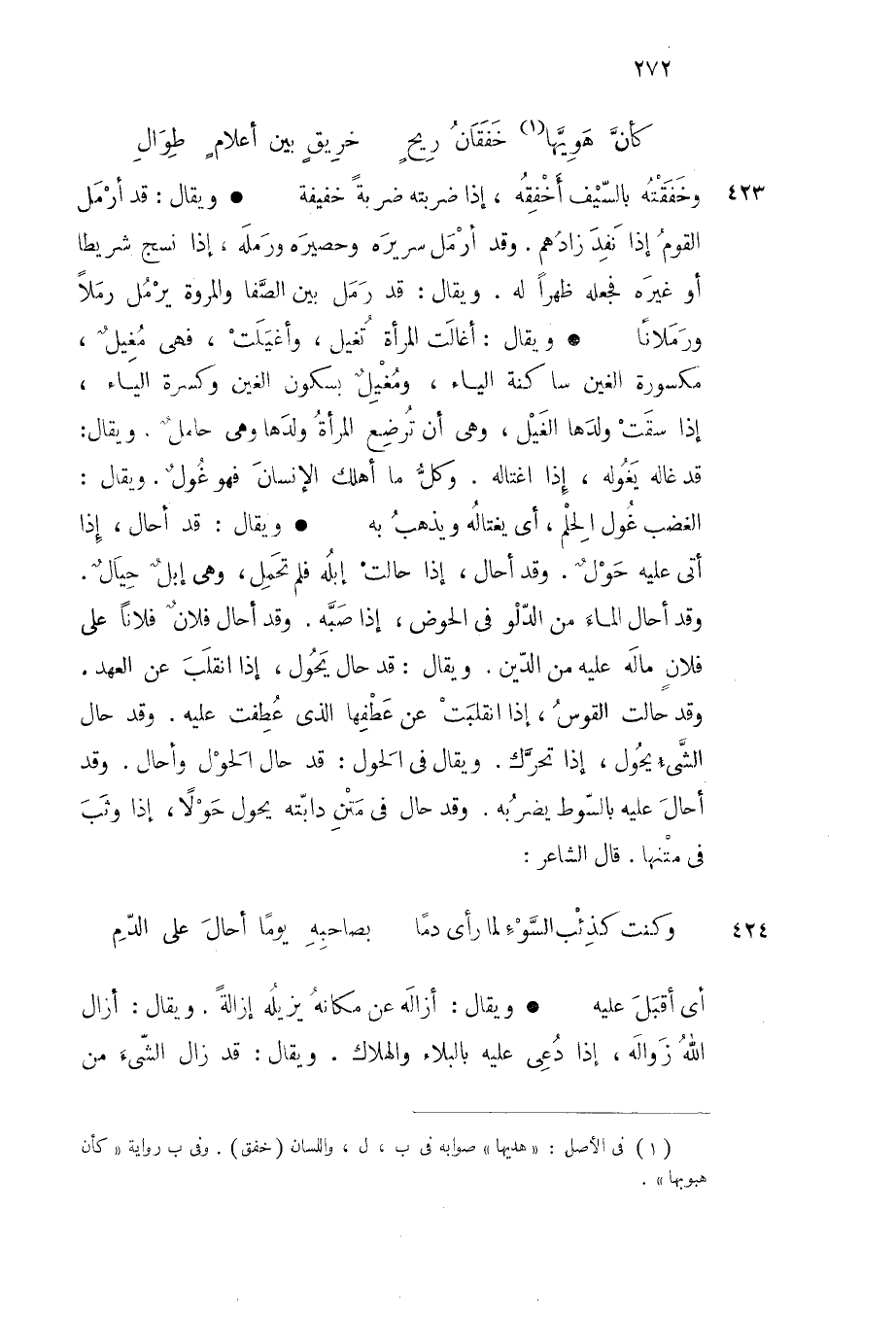 ويقال قد أحال إذا أتى عليه حول وقد أحال إذا حالت إبله فلم تحمل وهي إبل حيال وقد أحال الماء من الدلو في الحوض إذا صبه وقد أحال فلان فلانا على فلان ماله عليه من الدين