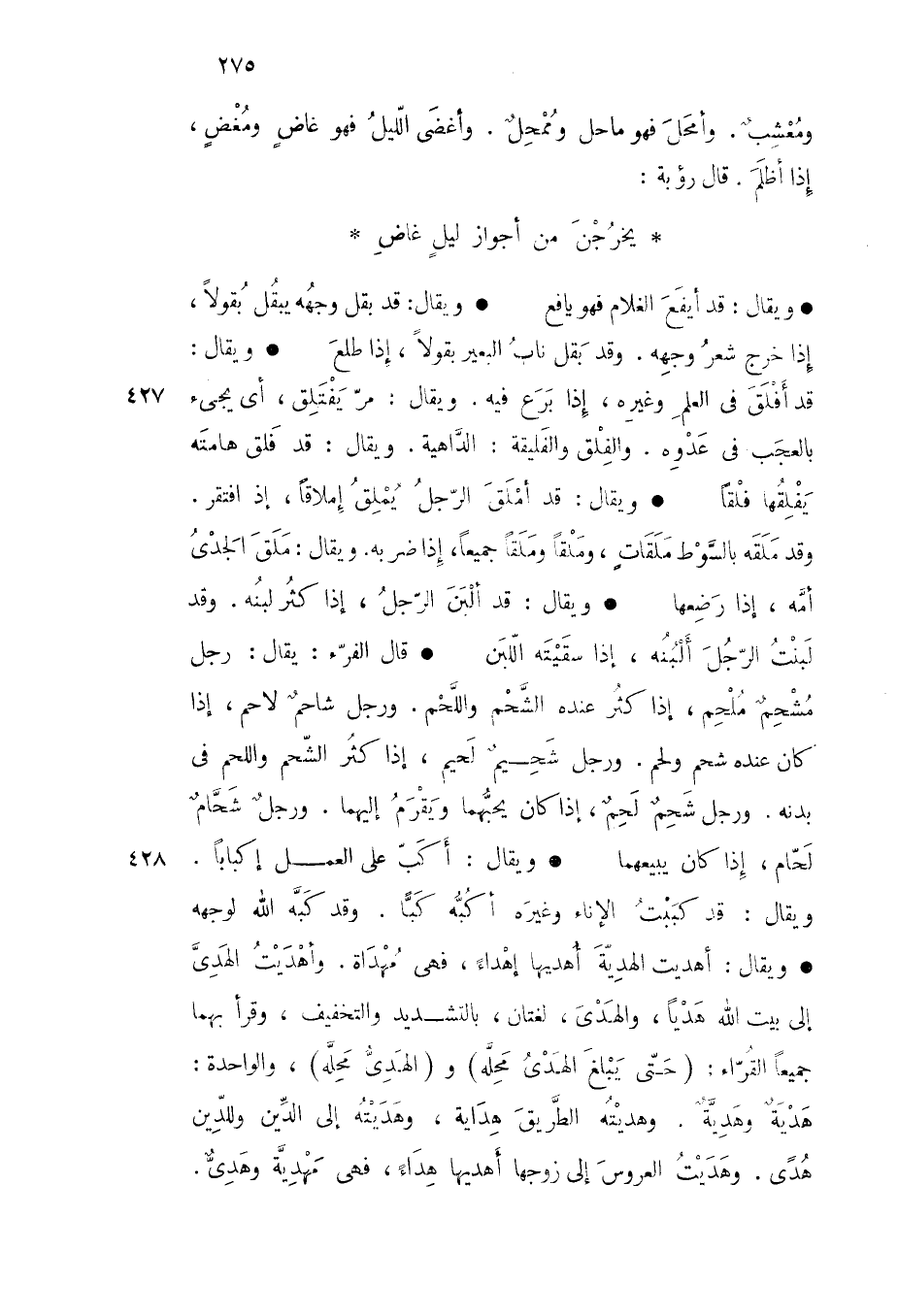 ومعشب وأمحل فهو ماحل وممحل وأغضى الليل فهو غاض ومغض إذا أظلم قال رؤبة