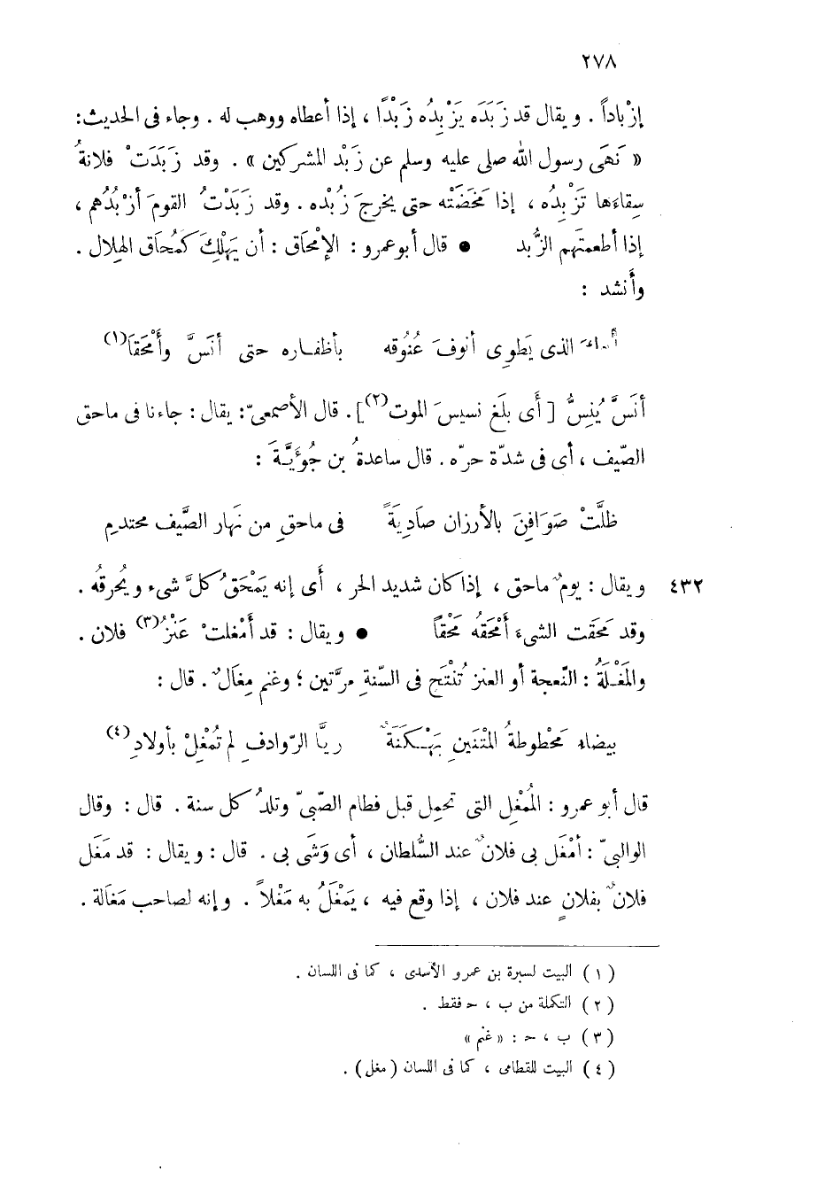 ويقال قد زبده يزبده زبدا إذا أعطاه ووهب له وجاء في الحديث نهى رسول الله عن زبد المشركين وقد زبدت فلانة سقاءها تزبده إذا مخضته حتى يخرج زبده وقد زبدت القوم أزبدهم إذا أطعمتهم الزبد قال أبو عمرو الإمحاق أن يهلك كمحاق الهلال وأنشد