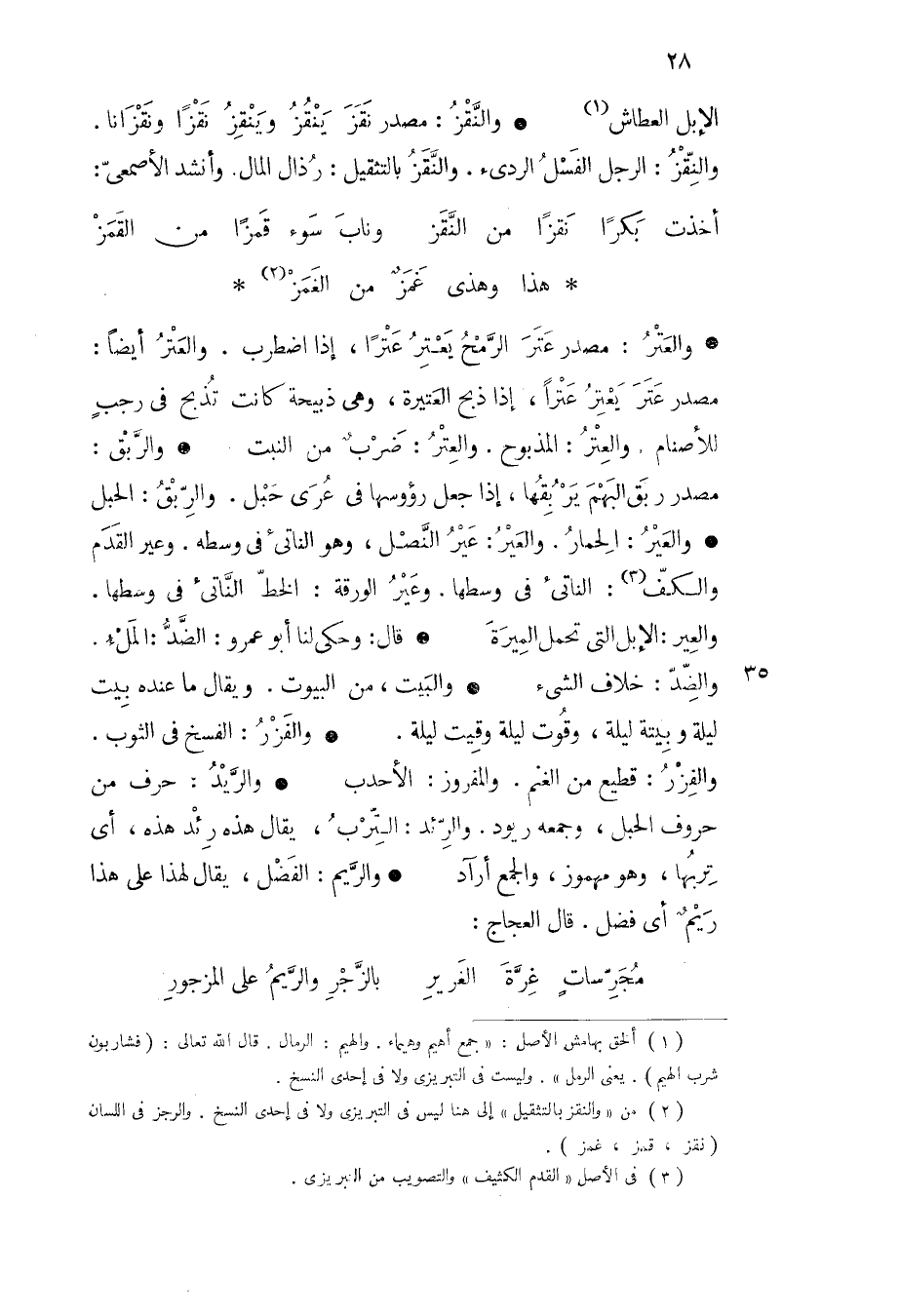 والعتر مصدر عتر الرمح يعتر عترا إذا اضطرب والعتر أيضا مصدر عتر يعتر عترا إذا ذبح العتيرة وهي ذبيحة كانت تذبح في رجب للأصنام والعتر المذبوح والعتر ضرب من النبت والربق مصدر ربق البهم يربقها إذا جعل رؤوسها في عرى حبل والربق الحبل والعير الحمار والعير عير النصل وهو الناتئ في وسطه وعير القدم والكف الناتئ في وسطها وعير الورقة الخط الناتئ في وسطها والعير الإبل التي تحمل الميرة قال وحكى لنا أبو عمرو الضد الملء والضد خلاف الشيء والبيت من البيوت