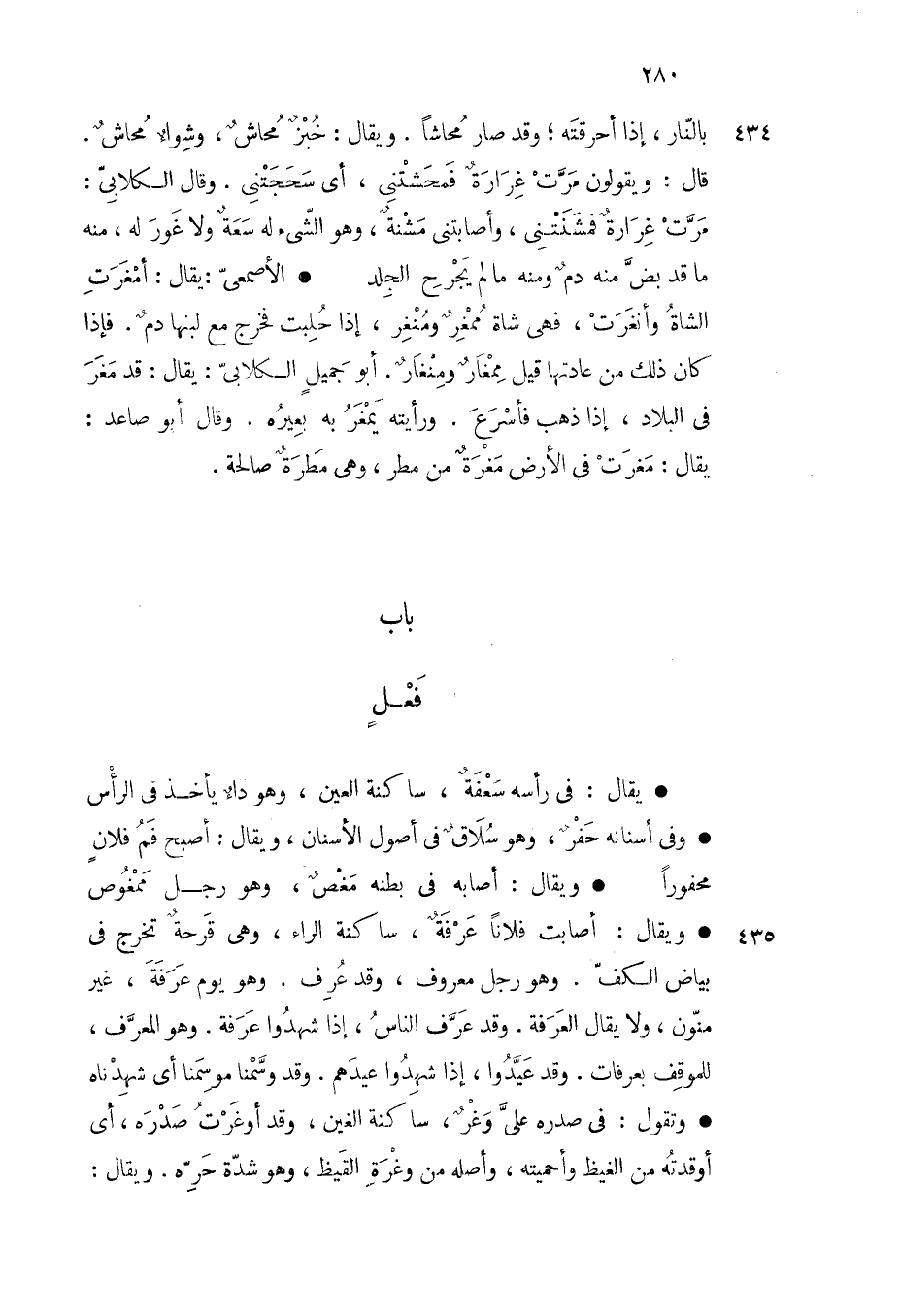 ويقال أصابت فلانا عرفة ساكنة الراء وهي قرحة تخرج في بياض الكف وهو رجل معروف وقد عرف وهو يوم عرفة غير منون ولا يقال العرفة وقد عرف الناس إذا شهدوا عرفة وهو المعرف للموقف بعرفات وقد عيدوا إذا شهدوا عيدهم وقد وسمنا موسمنا أي شهدناه وتقول في صدره علي وغر ساكنة الغين وقد أوغرت صدره أي أوقدته من الغيظ وأحميته وأصله من وغرة القيظ وهو شدة حره