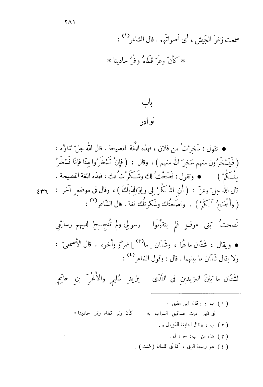 تقول سخرت من فلان فهذه اللغة الفصيحة قال الله جل ثناؤه ( فيسخرون منهم سخر الله منهم ) وقال ( فإن تسخروا منا فإنا نسخر منكم ) وتقول نصحت لك وشكرت لك فهذه اللغة الفصيحة قال الله جل وعز ( أن اشكر لي ولوالديك ) وقال في موضع آخر ( وأنصح لكم ) ونصحتك وشكرتك لغة قال الشاعر