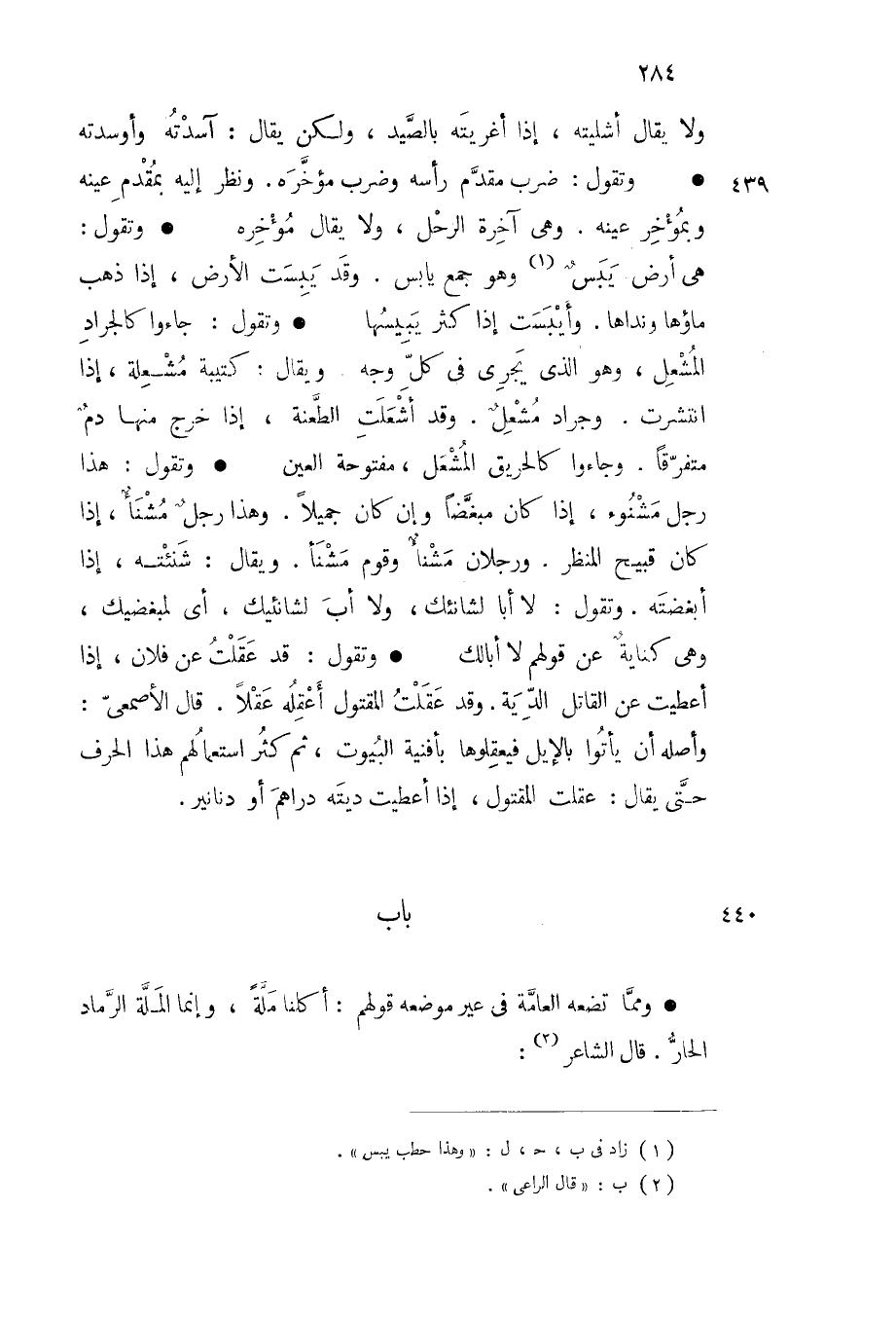 ولا يقال أشليته إذا أغريته بالصيد ولكن يقال آسدته وأوسدته وتقول ضرب مقدم رأسه وضرب مؤخره ونظر إليه بمقدم عينه وبمؤخر عينه وهي آخرة الرحل ولا يقال مؤخره وتقول هي أرض يبس وهو جمع يابس وقد يبست الأرض إذا ذهب ماؤها ونداها وأيبست إذا كثر يبيسها وتقول جاءوا كالجراد المشعل وهو الذي يجرى في كل وجه