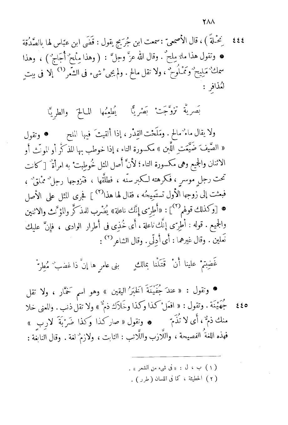 ولا يقال ماء مالح وملحت القدر إذا ألقيت فيها الملح وتقول الصيف ضيعت اللبن مكسورة التاء إذا خوطب بها المذكر أو المؤنث أو الاثنان والجميع وهي مكسورة التاء لأن أصل المثل خوطبت به امرأة كانت تحت رجل موسر فكرهته لكبر سنه فطلقها فتزوجها رجل مملق فبعثت إلى زوجها الأول تستميحه فقال لها هذا فجرى المثل على الأصل وكذلك قولهم أطري إنك ناعلة يضرب للمذكر والمؤنث والاثنين والجميع قوله أطري إنك ناعلة أي خذي في أطرار الوادي فإن عليك نعلين وقال غيرهما أي أدلي وقال الشاعر