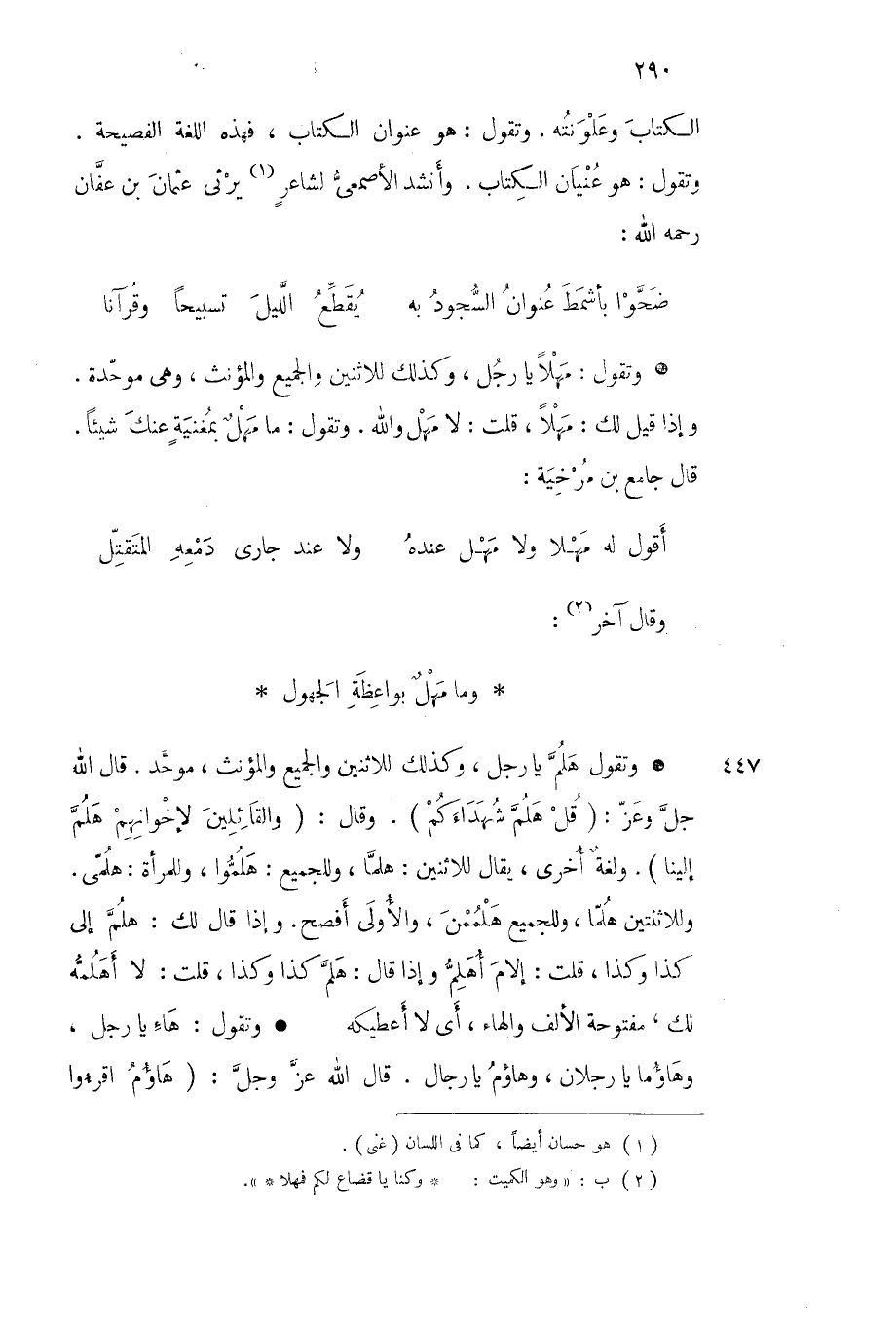 وتقول هلم يا رجل وكذلك للاثنين والجميع والمؤنث موحد قال الله جل وعز ( قل هلم شهداءكم ) وقال ( والقائلين لإخوانهم هلم إلينا ) ولغة أخرى يقال للاثنين هلما وللجميع هلموا وللمرأة هلمي وللاثنتين هلما وللجميع هلممن والأولى أفصح وإذا قال لك هلم إلى كذا وكذا قلت إلام أهلم وإذا قال هلم كذا وكذا قلت لا أهلمه لك مفتوحة الألف والهاء أي لا أعطيكه وتقول هاء يا رجل وهأوما يا رجلان وهأوم يا رجال قال الله عز وجل ( هأوم اقرءوا