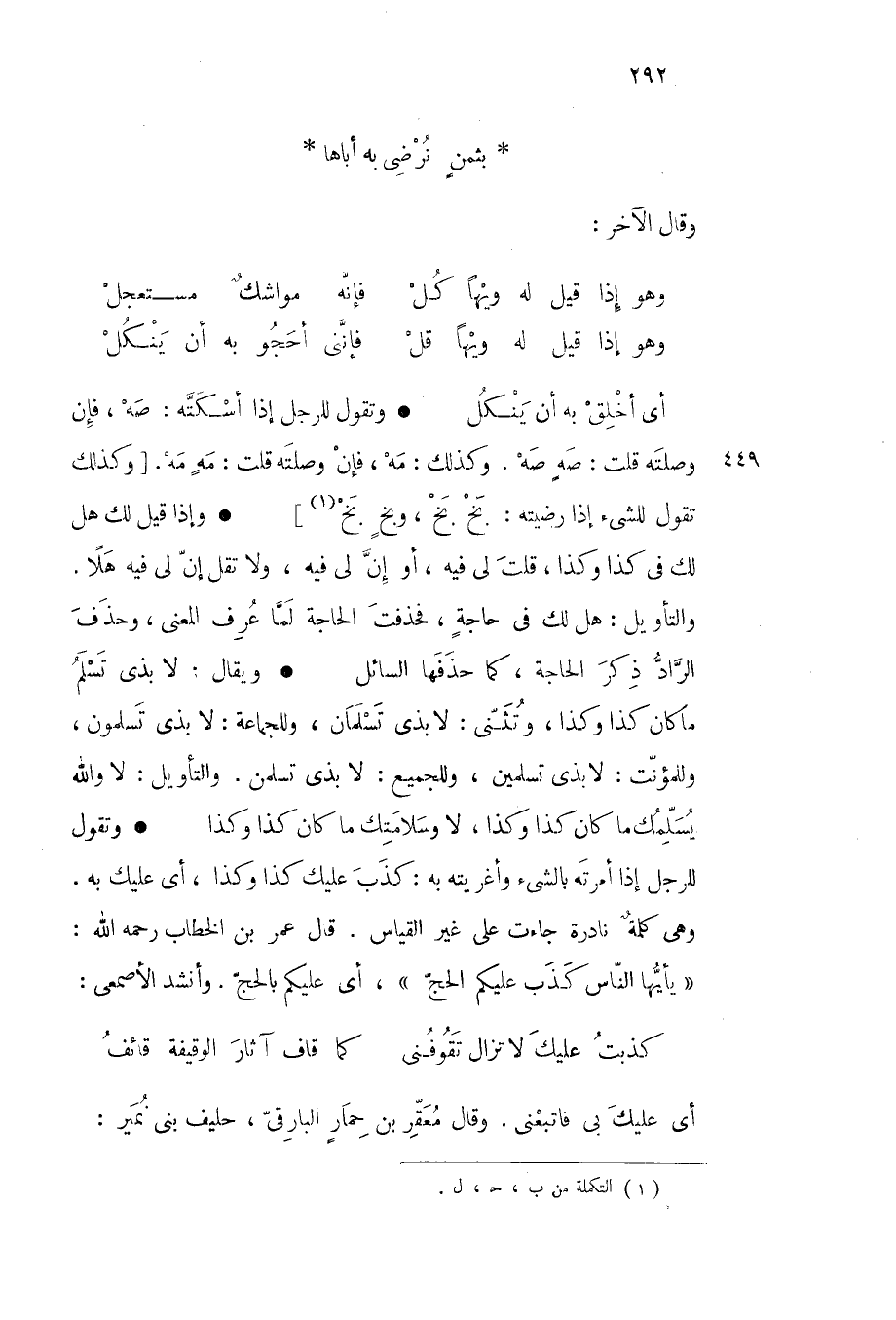 ويقال لا بذي تسلم ما كان كذا وكذا وتثنى لا بذي تسلمان وللجماعة لا بذي تسلمون وللمؤنث لا بذي تسلمين وللجميع لا بذي تسلمن والتأويل لا والله يسلمك ما كان كذا وكذا لا وسلامتك ما كان كذا وكذا وتقول للرجل إذا أمرته بالشيء وأغريته به كذب عليك كذا وكذا أي عليك به وهي كلمة نادرة جاءت على غير القياس قال عمر بن الخطاب رحمه الله يأيها الناس كذب عليكم الحج أي عليكم بالحج وأنشد الأصمعي