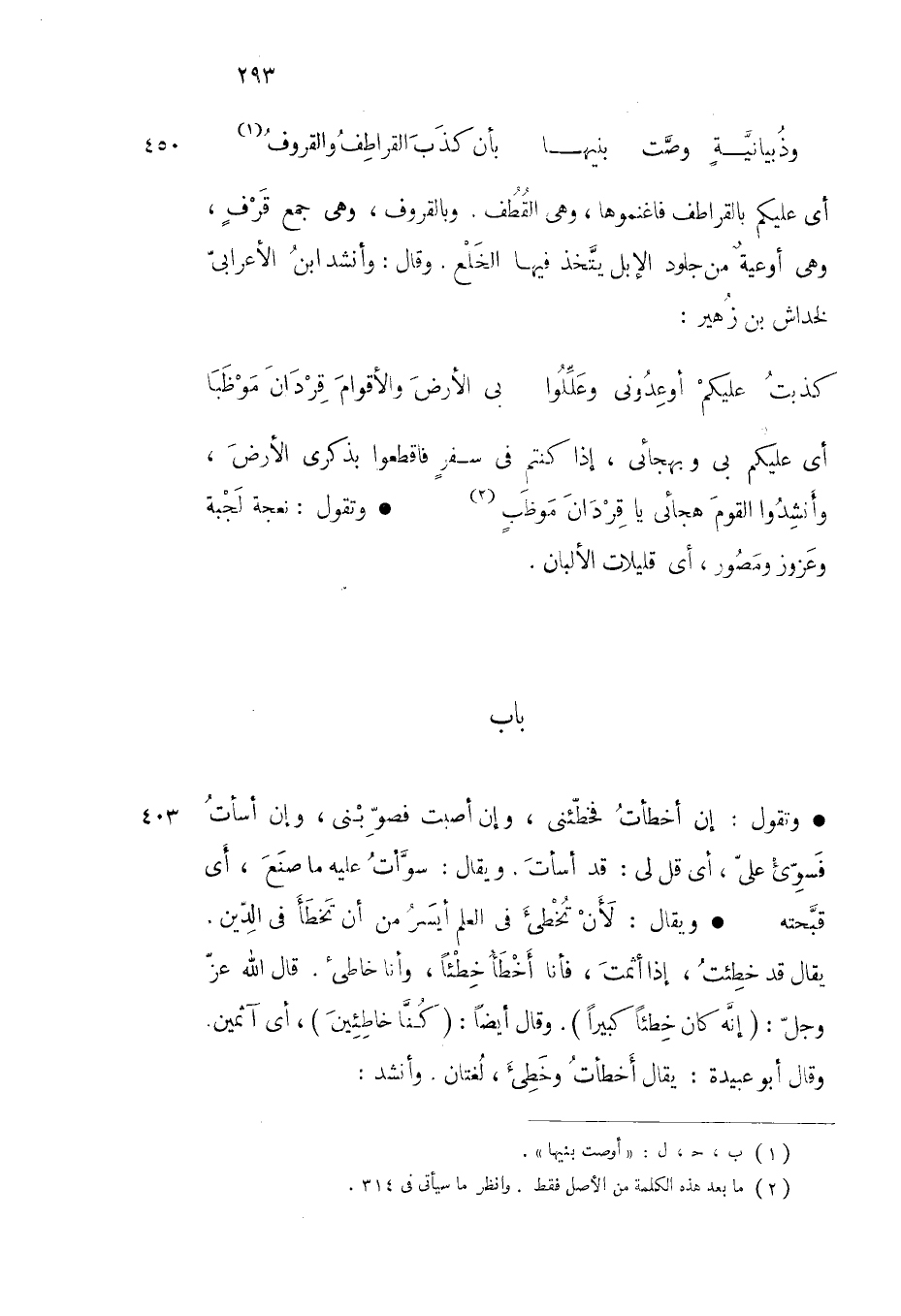 أي عليكم بي وبهجائي إذا كنتم في سفر فاقطعوا بذكرى الأرض وأنشدوا القوم هجائي يا قردان موظب وتقول نعجة لجبة وعزوز ومصور أي قليلات الألبان باب