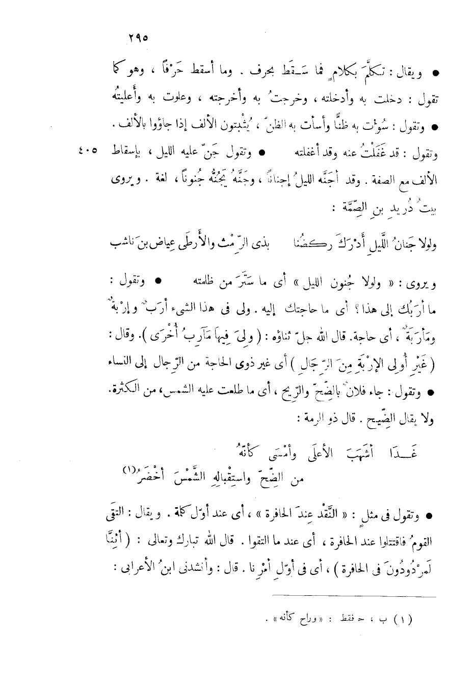ويروى ولولا جنون الليل أي ما ستر من ظلمته وتقول ما أربك إلى هذا أي ما حاجتك إليه ولي في هذا الشيء أرب وإربة ومأربة أي حاجة قال الله جل ثناؤه ( ولى فيها مآرب أخرى ) وقال ( غير أولى الإربة من الرجال ) أي غير ذوي الحاجة من الرجال إلى النساء وتقول جاء فلان بالضح والريح أي ما طلعت عليه الشمس من الكثرة ولا يقال الضيح قال ذو الرمة