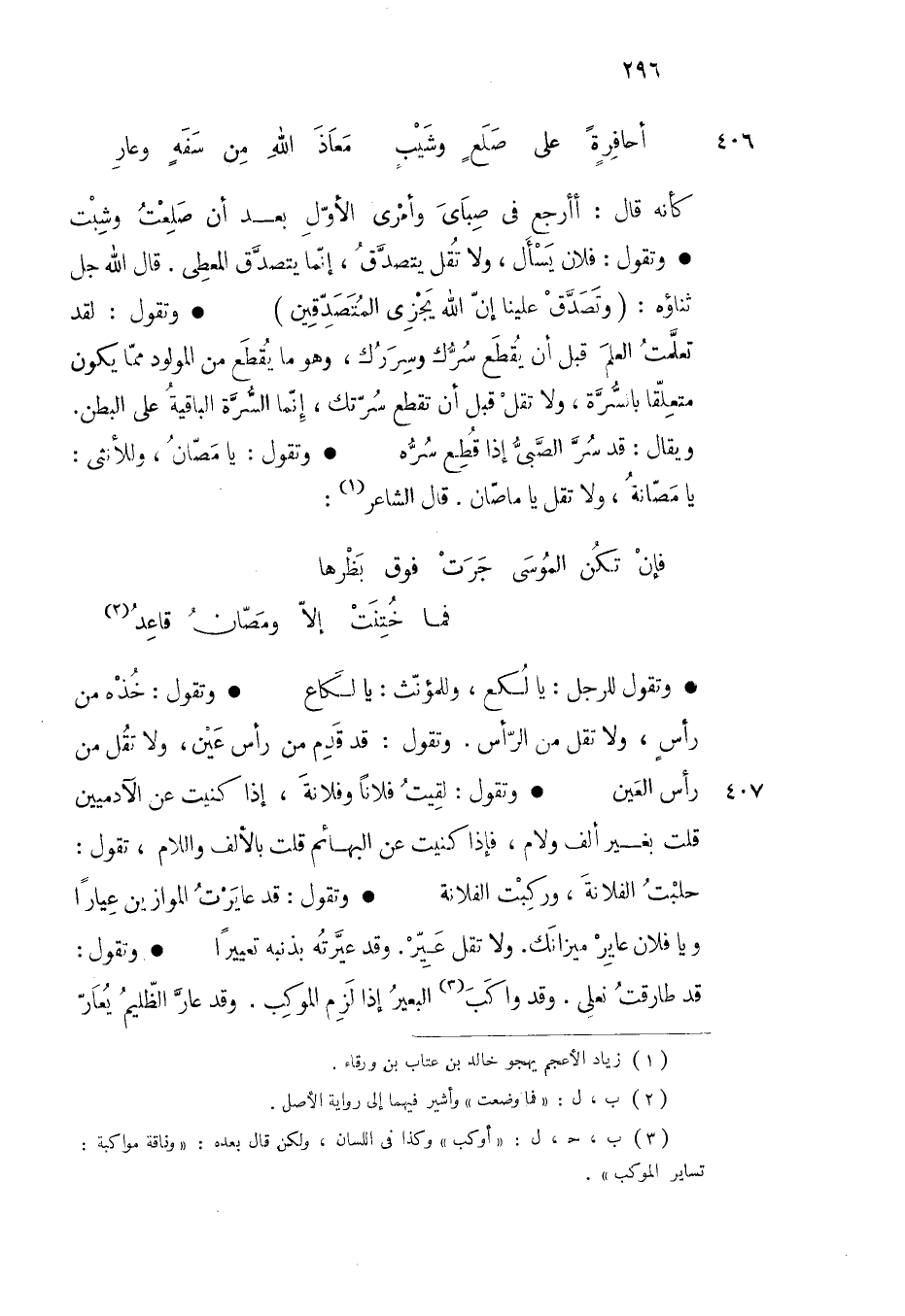 وتقول للرجل يا لكع وللمؤنث يا لكاع وتقول خذه من رأس ولا تقل من الرأس وتقول قد قدم من رأس عين ولا تقل من رأس العين وتقول لقيت فلانا وفلانة إذا كنيت عن الآدميين قلت بغير ألف ولام فإذا كنيت عن البهائم قلت بالألف واللام تقول حلبت الفلانة وركبت الفلانة وتقول قد عايرت الموازين عيارا ويا فلان عاير ميزانك ولا تقل عير وقد عيرته بذنبه تعييرا وتقول قد طارقت نعلي وقد واكب البعير إذا لزم الموكب وقد عار الظليم يعار