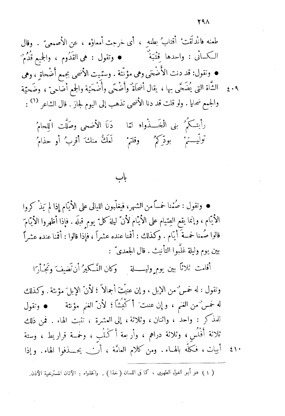 طعنه فاندلقت أقتاب بطنه أي خرجت أمعاؤه عن الأصمعي وقال الكسائي واحدها قتبة وتقول هي القدوم والجميع قدم وتقول قد دنت الأضحى وهي مؤنثة وسميت الأضحى بجمع أضحاة وهي الشاة التي يضحى بها يقال أضحاة وأضحى وأضحية والجمع أضاحي وضحية والجمع ضحايا ولو قلت قد دنا الأضحى تذهب إلى اليوم لجاز قال الشاعر