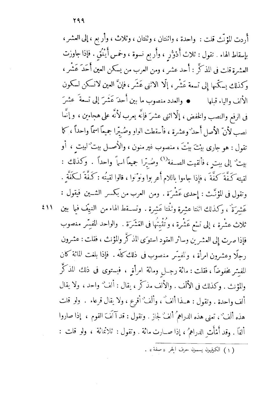 أردت المؤنث قلت واحدة واثنتان وثنتان وثلاث وأربع إلى العشر بإسقاط الهاء تقول ثلاث أدؤر وأربع نسوة وخمس أينق فإذا جاوزت العشرة قلت في المذكر أحد عشر ومن العرب من يسكن العين أحد عشر وكذلك يسكنها إلى تسعة عشر إلا الاثني عشر فإن العين لا تسكن لسكون الألف والياء قبلها والعدد منصوب ما بين أحد عشر إلى تسعة عشر في الرفع والنصب والخفض إلا اثني عشر فإنه يعرب لأنه على هجاءين وإنما نصب لأن الأصل أحد وعشرة فأسقطت الواو وصيرا جميعا اسما واحدا كما تقول هو جاري بيت بيت منصوب غير منون والأصل بيت لبيت أو بيت إلى بيت فألقيت الصفة وصيرا جميعا اسما واحدا وكذلك لقيته كفة كفة فإذا جاءوا باللام أعربوا ونونوا قالوا لقيته كفة لكفة وتقول في المؤنث إحدى عشرة ومن العرب من يكسر الشين فيقول عشرة وكذلك اثنتا عشرة وثنتا عشرة وتسقط الهاء من النيف فيما بين ثلاث عشرة إلى تسع عشرة وتثبتها في العشرة والواحد المفسر منصوب فإذا صرت إلى العشرين وسائر العقود استوى الذكر والمؤنث فقلت عشرون رجلا وعشرون امرأة والمفسر منصوب في ذلك كله فإذا بلغت المائة كان المفسر مخفوضا فقلت مائة رجل ومائة امرأة فيستوي في ذلك المذكر والمؤنث وكذلك في الألف والألف مذكر يقال ألف واحد ولا يقال ألف واحدة وتقول هذا ألف وألف أقرع ولا يقال قرعاء ولو قلت هذه ألف تعني هذه الدراهم ألف لجاز وتقول قد آلف القوم إذا صاروا ألفا وقد أمأت الدراهم إذا صارت مائة وتقول ثلاثمائة ولو قلت