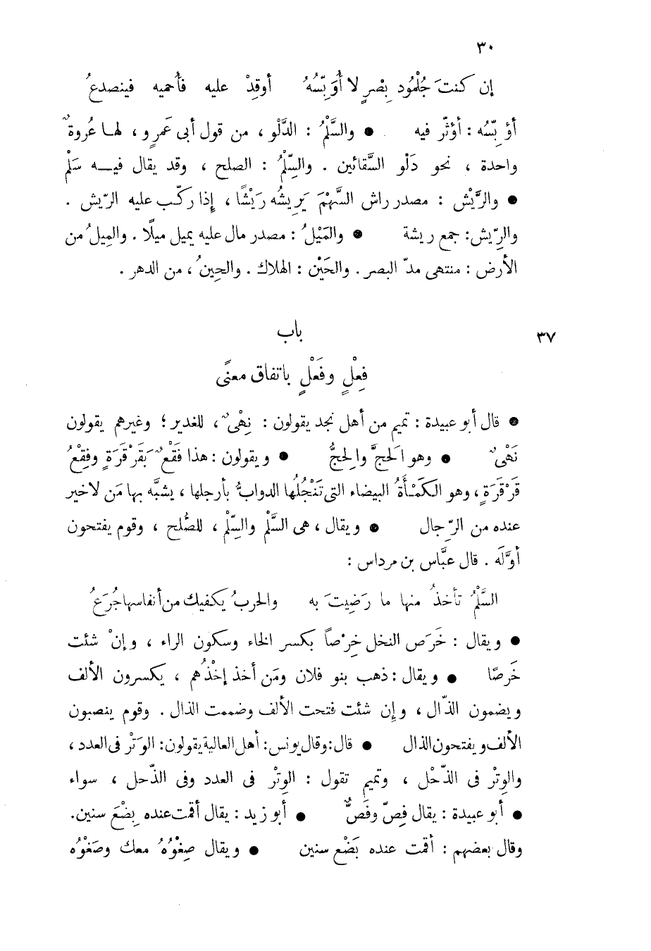 قال أبو عبيدة تميم من أهل نجد يقولون نهى للغدير وغيرهم يقولون نهي وهو الحج والحج ويقولون هذا فقع بقرقرة وفقع قرقرة وهو الكمأة البيضاء التي تنجلها الدواب بأرجلها يشبه بها من لا خير عنده من الرجال