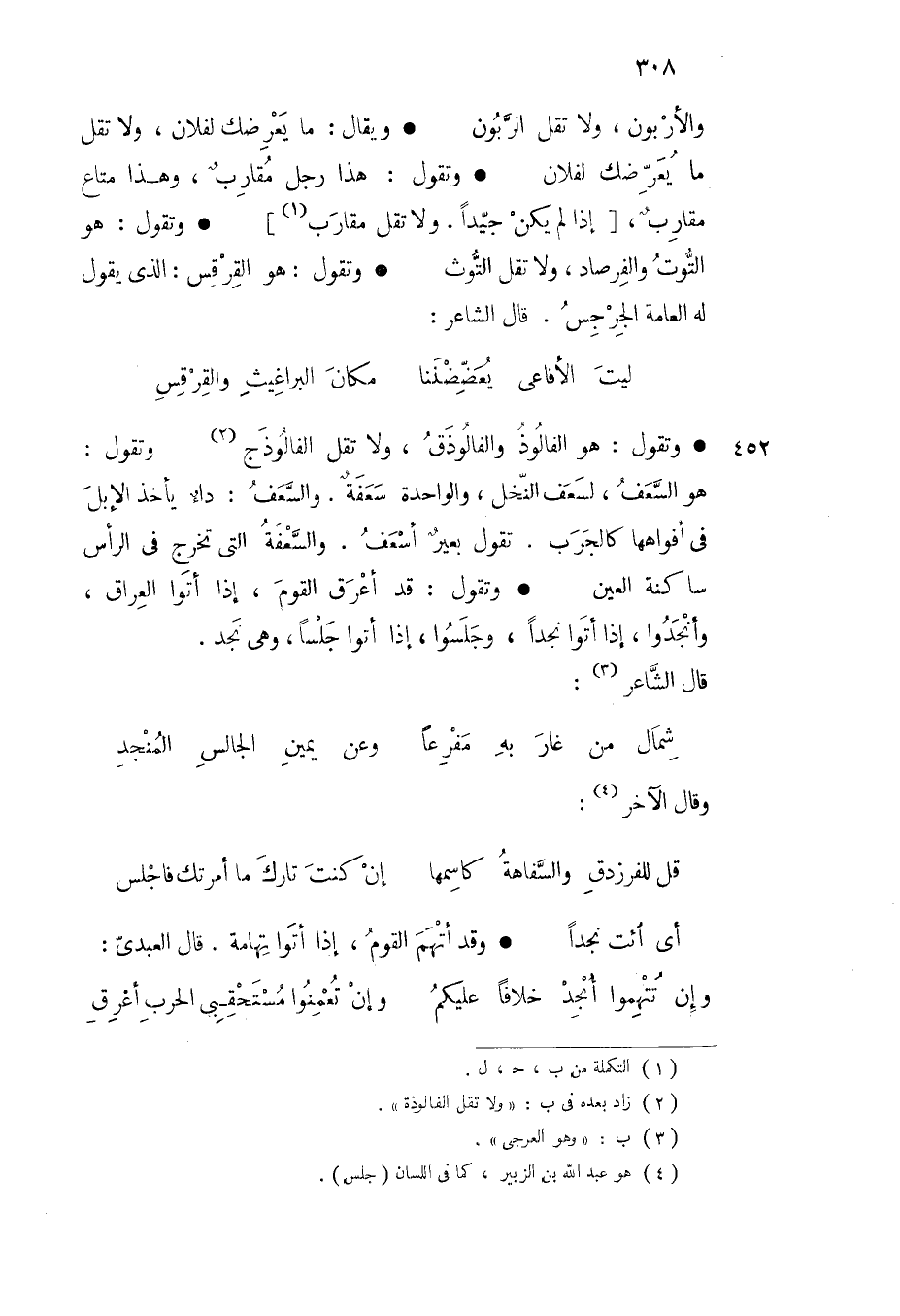 وتقول هو الفالوذ والفالوذق ولا تقل الفالوذج وتقول هو السعف لسعف النخل والواحدة سعفة والسعف داء يأخذ الإبل في أفواهها كالجرب تقول بعير أسعف والسعفة التي تخرج في الرأس ساكنة العين وتقول قد أعرق القوم إذا أتوا العراق وأنجدوا إذا أتوا نجدا وجلسوا إذا أتوا جلسا وهي نجد