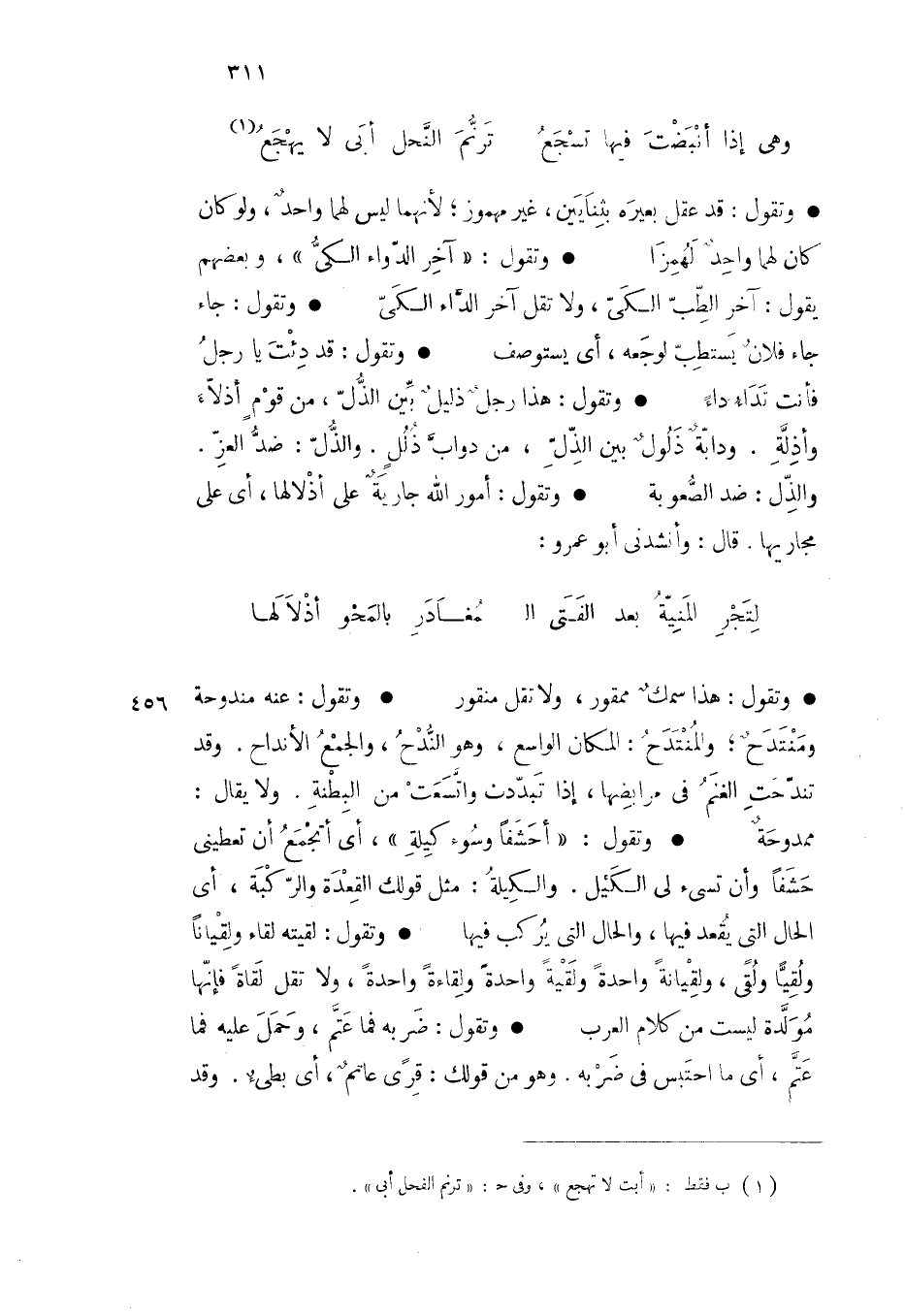 وتقول قد عقل بعيره بثنايين غير مهموز لأنهما ليس لهما واحد ولو كان لهما واحد لهمزا وتقول آخر الدواء الكي وبعضهم يقول آخر الطب الكي ولا تقل آخر الداء الكي وتقول جاء فلان يستطب لوجعه أي يستوصف وتقول قد دئت يا رجل فأنت تداء داء وتقول هذا رجل ذليل بين الذل من قوم أذلاء وأذلة ودابة ذلول بين الذل من دواب ذلل والذل ضد العز والذل ضد الصعوبة وتقول أمور الله جارية على أذلالها أي على مجاريها قال وأنشدني أبو عمرو