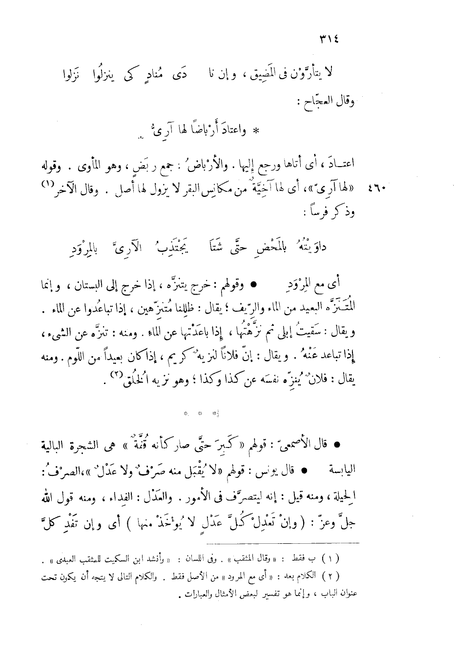 اعتاد أي أتاها ورجع إليها والأرباض جمع ربض وهو المأوى وقوله لها آرى أي لها آخية من مكانس البقر لا يزول لها أصل وقال الآخر وذكر فرسا