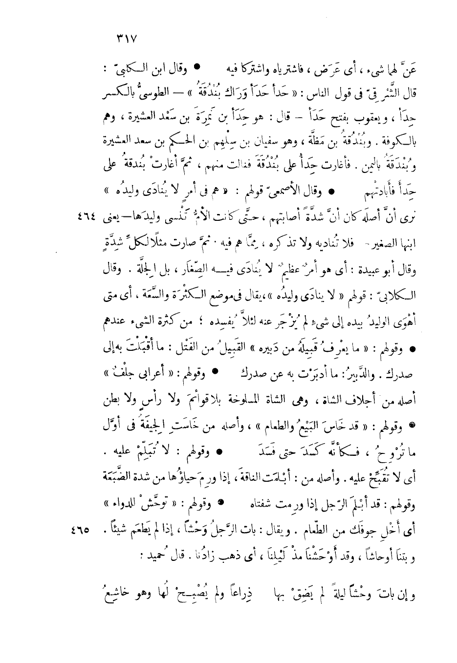 قال الشرقي في قول الناس حدأ حدأ وراك بندقة الطوسي بالكسر حدأ ويعقوب بفتح حدأ قال هو حدأ بن نمرة بن سعد العشيرة وهم بالكوفة وبندقة بن مظة وهو سفيان بن سلهم بن الحكم بن سعد العشيرة وبندقة باليمن فأغارت حدأ على بندقة فنالت منهم ثم أغارت بندقة على حدأ فأبادتهم وقال الأصمعي قولهم هم في أمر لا ينادى وليده نرى أن أصله كان أن شدة أصابتهم حتى كانت لأم تنسى وليدها يعنى ابنها الصغير فلا تناديه ولا تذكره مما هم فيه ثم صارت مثلا لكل شدة وقال أبو عبيدة أي هو أمر عظيم لا ينادى فيه الصغار بل الجلة وقال الكلابي قولهم لا ينادى وليده يقال في موضع الكثرة والسعة أي متى أهوى الوليد بيده إلى شيء لم يزجر عنه لئلا يفسده من كثرة الشيء عندهم وقولهم ما يعرف قبيله من دبيره القبيل من الفتل ما أقبلت به إلى صدرك والدبير ما أدبرت به عن صدرك وقولهم أعرابي جلف أصله من أجلاف الشاة وهي الشاة المسلوخة بلا قوائم ولا رأس ولا بطن وقولهم قد خاس البيع والطعام وأصله من خاست الجيفة في أول ما تروح فكأنه كسد حتى فسد وقولهم لا تبلم عليه أي لا تقبح عليه وأصله من أبلمت الناقة إذا ورم حياؤها من شدة الضبعة وقولهم قد أبلم الرجل إذا ورمت شفتاه وقولهم توحش للدواء أي أخل جوفك من الطعام