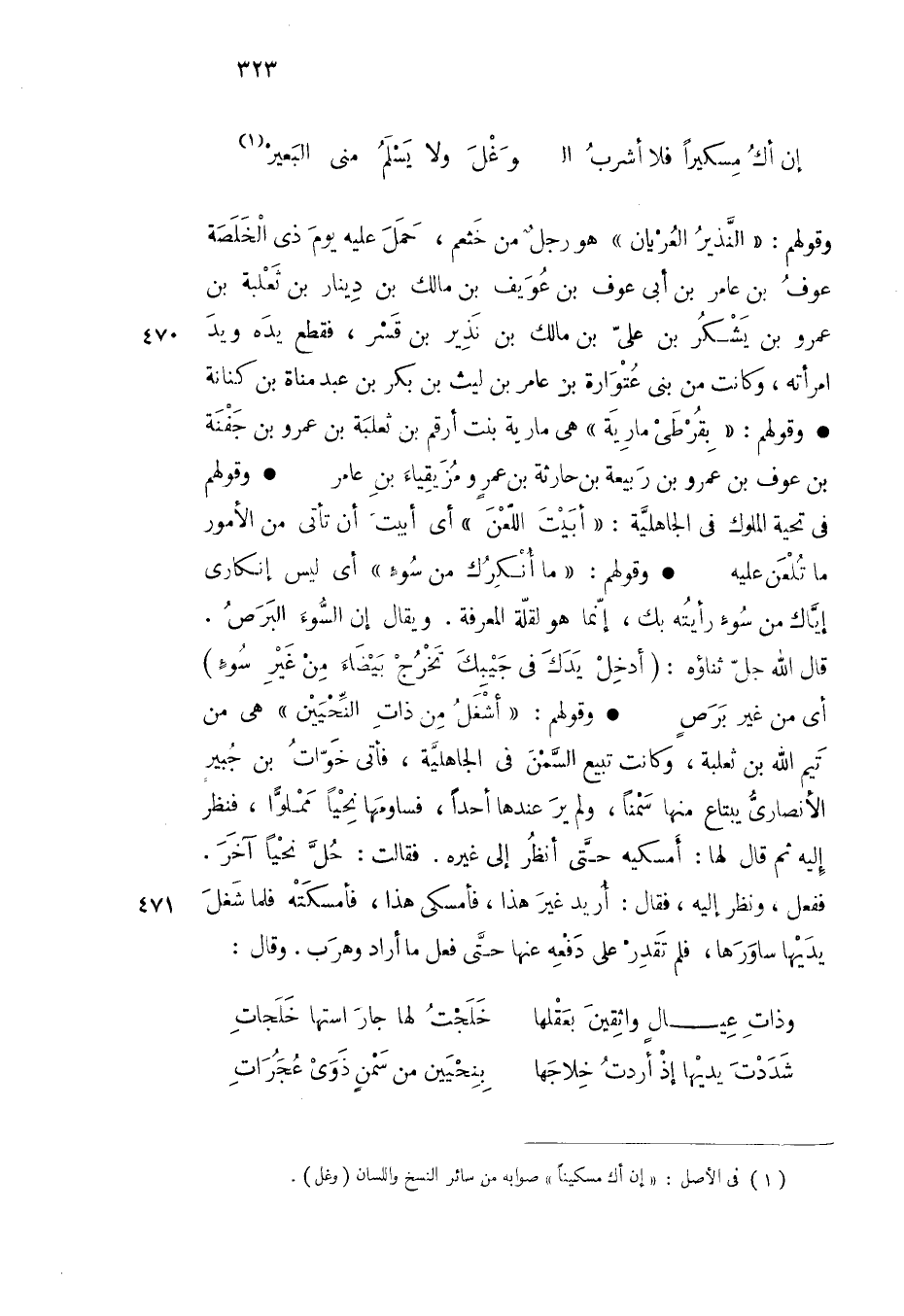 وقولهم النذير العريان هو رجل من خثعم حمل عليه يوم ذى الخلصة عوف بن عامر بن أبي عوف بن عويف بن مالك بن دينار بن ثعلبة بن عمرو بن يشكر بن علي بن مالك بن نذير بن قسر فقطع يده ويد امرأته وكانت من بني عتوارة بن عامر بن ليث بن بكر بن عبد مناة بن كنانة وقولهم بقرطئ مارية هي مارية بنت أرقم بن ثعلبة بن عمرو بن جفنة بن عوف بن عمرو بن ربيعة بن حارثة بن عمرو مزيقياء بن عامر وقولهم في تحية الملوك في الجاهلية أبيت اللعن أي أبيت أن تأتي من الأمور ما تلعن عليه وقولهم ما أنكرك من سوء أي ليس إنكارى إياك من سوء رأيته بك إنما هو لقلة المعرفة