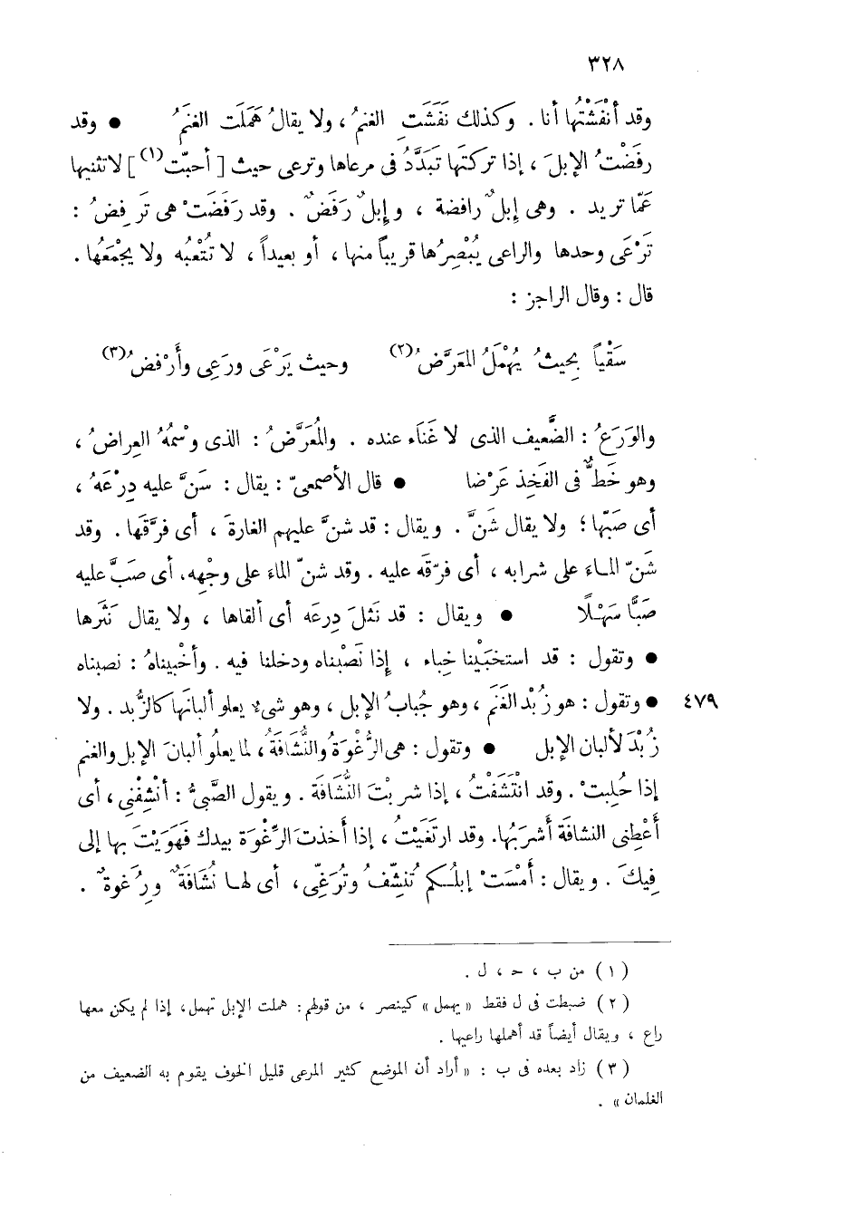 ويقال قد نثل درعه أي ألقاها ولا يقال نثرها وتقول قد استخبينا خباء إذا نصبناه ودخلنا فيه وأخبيناه نصبناه وتقول هو زبد الغنم وهو جباب الإبل وهو شيء يعلو ألبانها كالزبد ولا زبد لألبان الإبل وتقول هي الرغوة والنشافة لما يعلو ألبان الإبل والغنم إذا حلبت وقد انتشفت إذا شربت النشافة ويقول الصبي أنشفني أعطني النشافة أشربها وقد ارتغيت إذا أخذت الرغوة بيدك فهويت بها إلى فيك