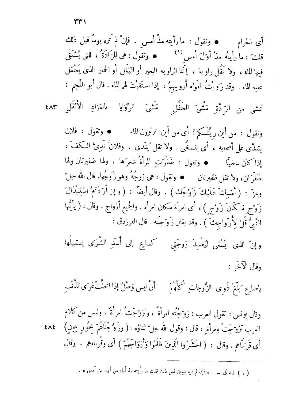 أي الحرام وتقول ما رأيته مذ أمس فإن لم تره يوما قبل ذلك قلت ما رأيته مذ أول أمس وتقول هي المزادة للتي يستقى فيها الماء ولا تقل راوية إنما الراوية البعير أو البغل أو الحمار الذي يحمل عليه الماء وقد رويت القوم أرويهم إذا استقيت لهم الماء قال أبو النجم