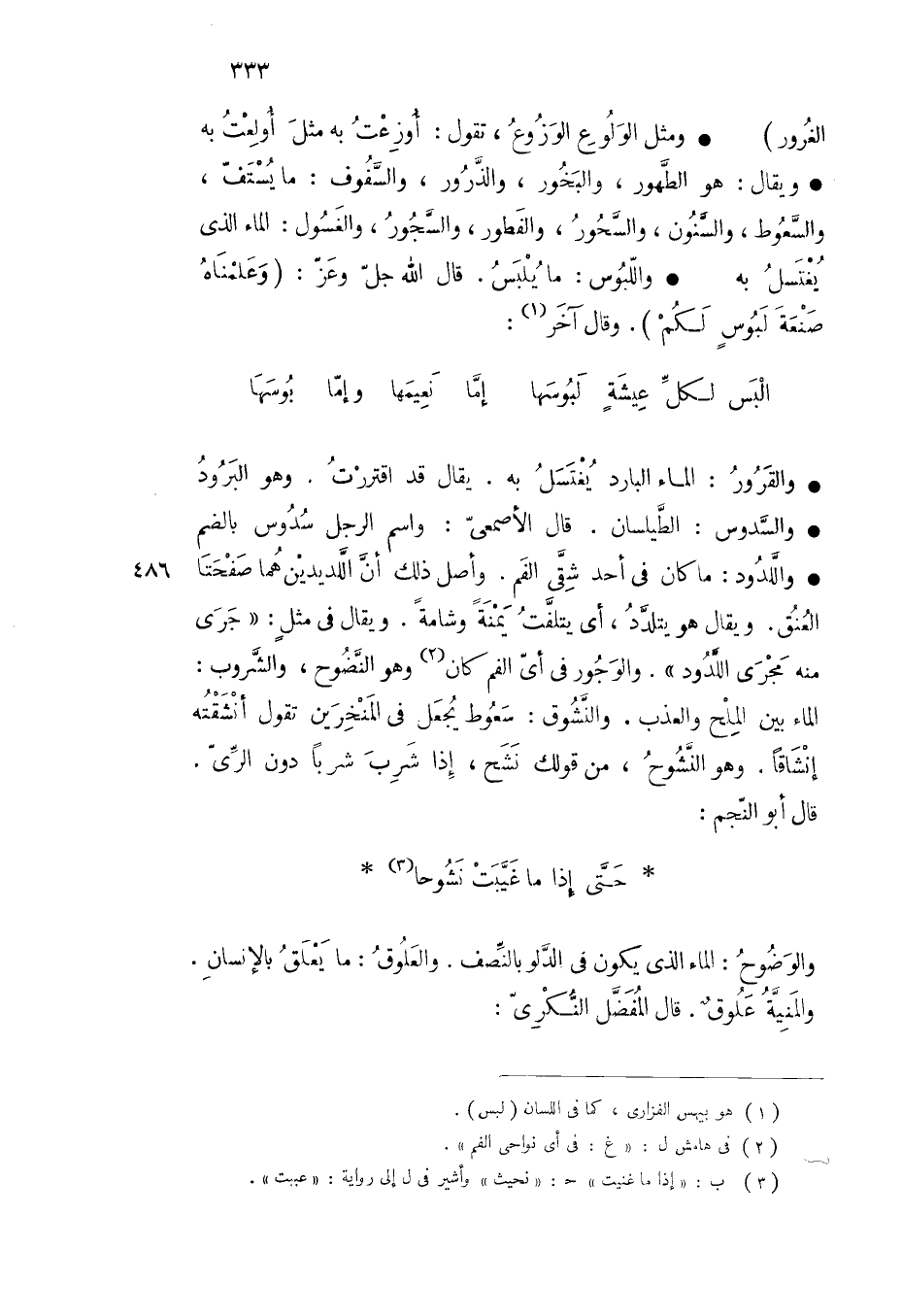 ويقال في مثل جرى منه مجرى اللدود والوجور في أي الفم كان وهو النضوح والشروب الماء بين الملح والعذب والنشوق سعط يجعل في المنخرين تقول أنشقته إنشاقا وهو النشوح من قولك نشح إذا شرب شربا دون الري قال أبو النجم
