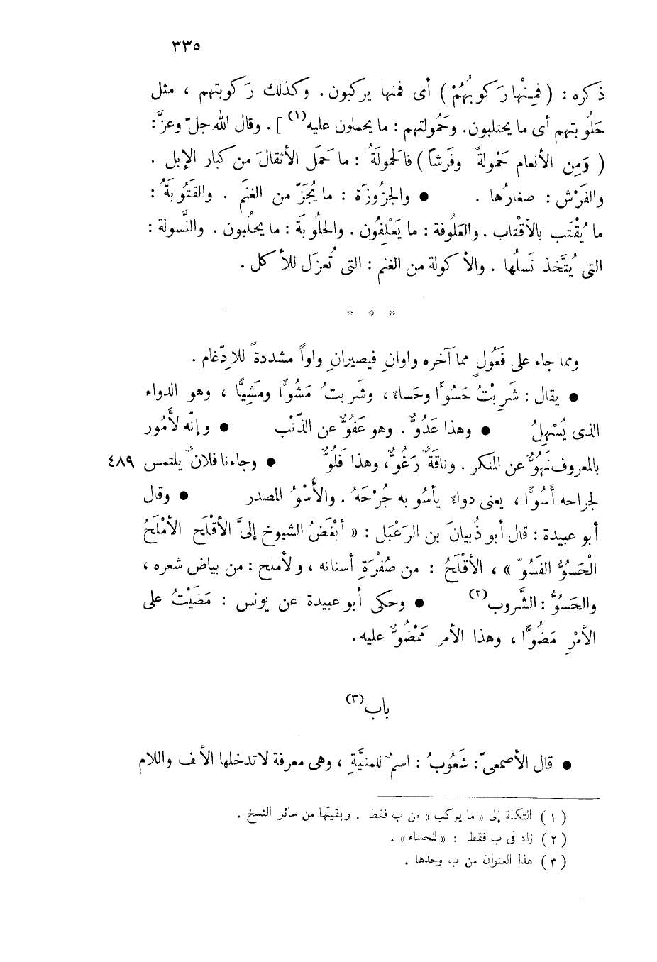 يقال شربت حسوا وحساء وشربت مشوا ومشيا وهو الدواء الذي يسهل وهذا عدو وهو عفو عن الذنب وإنه لأمور بالمعروف نهو عن المنكر وناقة رغو وهذا فلو وجاءنا فلان يلتمس لجراحه أسوا يعني دواء يأسو به جرحه والأسو المصدر وقال أبو عبيدة قال أبو ذبيان بن الرعبل أبغض الشيوخ إلى الأقلح الأملح الحسو الفسو الأقلح من صفرة أسنانه والأملح من بياض شعره والحسو الشروب وحكى أبو عبيدة عن يونس مضيت على الأمر مضوا وهذا الأمر ممضو عليه باب