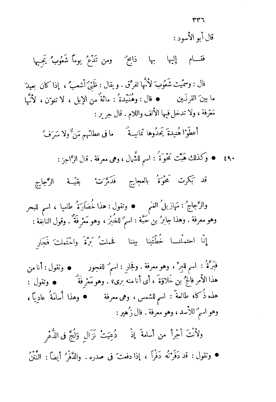 فبرة اسم للبر وهو معرفة وفجار اسم للفجور وتقول أنا من هذا الأمر فالج بن خلاوة أي أنا منه بريء وهو معرفة وتقول هذه ذكاء طالعة اسم للشمس وهي معرفة وهذا أسامة عاديا وهو اسم للأسد وهو معرفة قال زهير