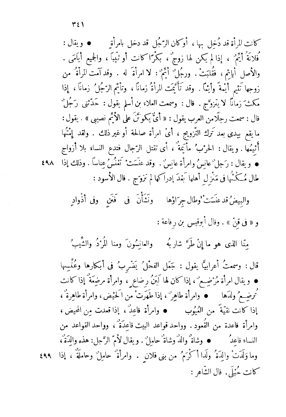 ويقال امرأة مرضع إذا كان لها لبن رضاع وامرأة مرضعة إذا كانت ترضع ولدها وامرأة طاهر إذا طهرت من الحيض وامرأة طاهرة إذا كانت نقية من العيوب وامرأة قاعد إذا قعدت من المحيض وامرأة قاعدة من القعود وواحد قواعد البيت قاعدة وواحد القواعد من النساء قاعد وشاة والد وشاة حامل