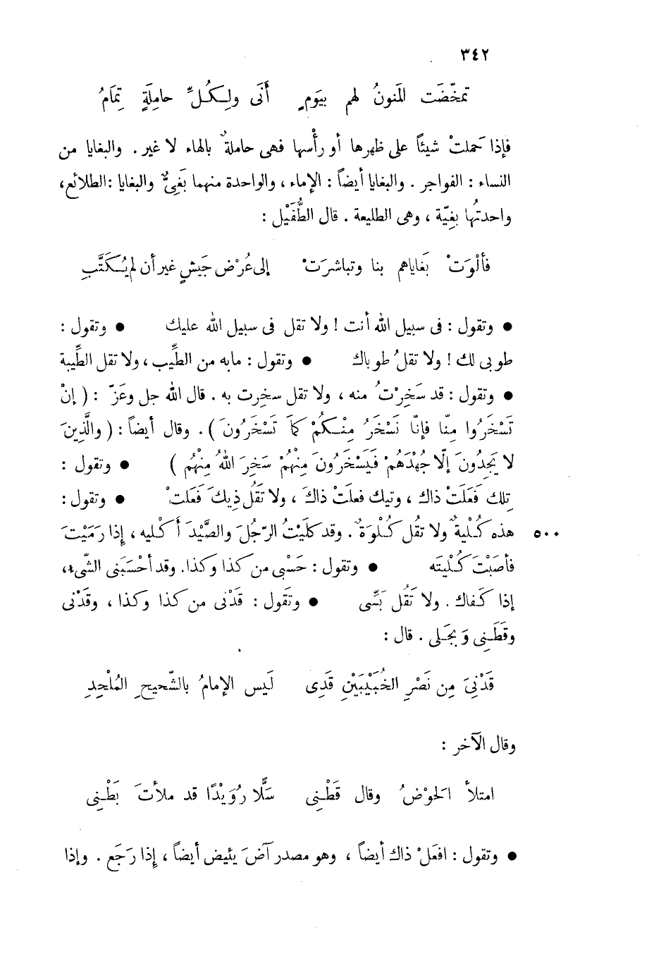 وتقول في سبيل الله أنت ولا تقل في سبيل الله عليك وتقول طوبى لك ولا تقل طوباك وتقول ما به من الطيب ولا تقل الطيبة وتقول قد سخرت منه ولا تقل سخرت به قال الله جل وعز ( إن تسخروا منا فإنا نسخر منكم كما تسخرون ) وقال أيضا ( والذين لا يجدون إلا جهدهم فيسخرون منهم سخر الله منهم ) وتقول تلك فعلت ذاك وتيك فعلت ذاك ولا تقل ذيك فعلت وتقول هذه كلية ولا تقل كلوة وقد كليت الرجل والصيد أكليه إذا رميت فأصبت كليته وتقول حسبي من كذا وكذا وقد أحسبني الشيء إذا كفاك ولا تقل بسي وتقول قدني من كذا وكذا وقدني وقطني وبجلي قال
