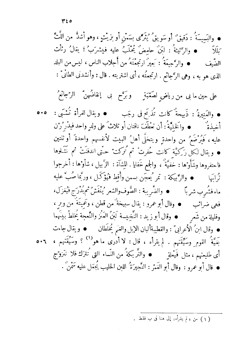 ويقال لكل ركية كانت حفرت ثم تركت حتى اندفنت ثم نثلوها فاحتفروها وشأوها خفية والجمع خفايا المشآة الزبيل شأوها أخرجوا ترابها والربيكة تمر يعجن بسمن وأقط فيؤكل وربما صب عليه ماء فشرب شربا والضريبة الصوف والشعر ينفش ثم يدرج فيغزل فهي ضرائب وقال أبو عمرو يقال سبيخة من قطن وعميتة من وبر وفليلة من شعر وقال أبو زيد النخيسة لبن العنز والنعجة يخلط بينهما