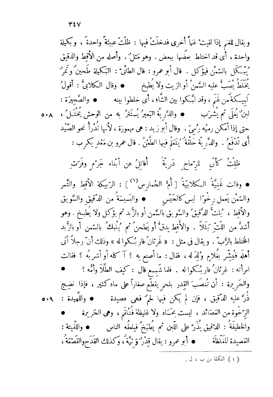 ويقال في مثل غرثان فاربكوا له وذلك أن رجلا أتى أهله فبشر بغلام ولد له فقال ما أصنع به آكله أو أشربه فقالت امرأته غرثان فاربكوا له فلما شبع قال كيف الطلا وأمه والحريرة أن تنصب القدر بلحم يقطع صغارا على ماء كثير فإذا نضج ذر عليه الدقيق فإن لم يكن فيها لحم فهي عصيدة واللهيدة الرخوة من العصائد ليست بحساء ولا غليظة فتلقم وهي الحريرة