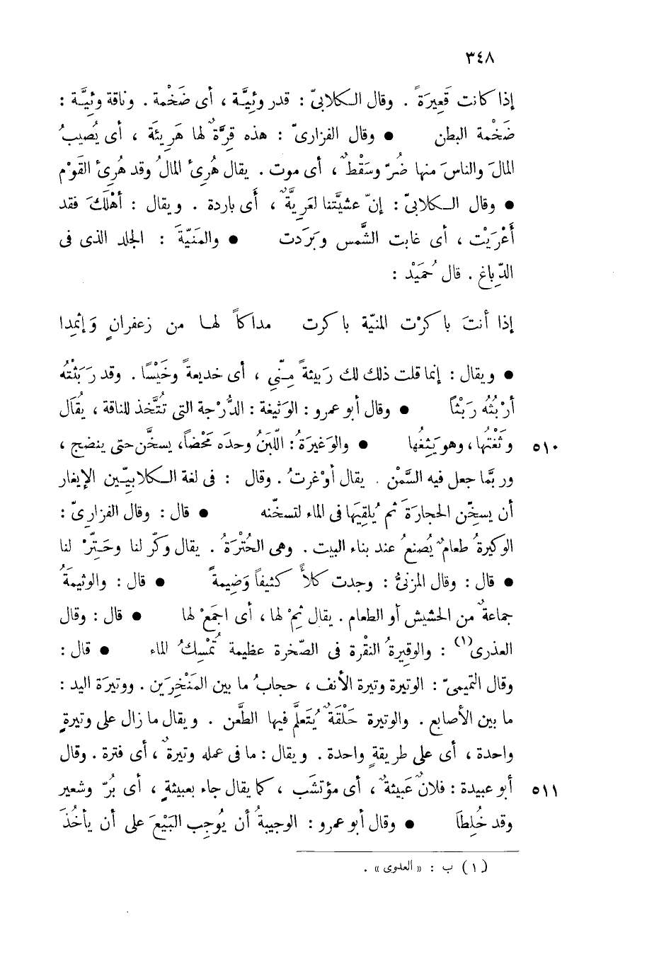 إذا كانت قعيرة وقال الكلابي قدر وئية أي ضخمة وناقة وئية ضخمة البطن وقال الفزاري هذه قرة لها هريئة أي يصيب المال والناس منها ضر وسقط أي موت يقال هرئ المال وقد هرئ القوم