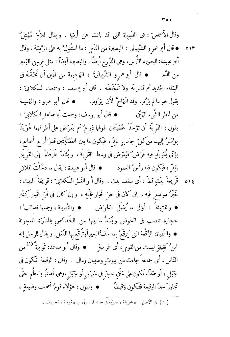 ويقال للأم مبتل قال أبو عمرو الشيباني البصيرة من الدم ما استدل به على الرمية وقال أبو عبيدة البصيرة الترس وهي الدرع أيضا والبصيرة أيضا مثل فرسن البعير من الدم قال أبو عمرو الشيباني الهجيمة من اللبن أن تحقنه في السقاء الجديد ثم تشربه ولا تمخضه قال أبو يوسف وسمعت الكلابي يقول هو مالم يرب وقد الهاج لأن يروب قال أبو عمرو والهميمة من المطر الشيء الهين قال أبو يوسف وسمعت أبا صاعد الكلابي يقول القرية أن تؤخذ عصيتان طولهما ذراع ثم يعرض على أطرافهما عويد يؤسر إليهما من كل جانب بقد فيكون ما بين العصيتين قدر أربع أصابع يؤتى بعويد فيه فرض فيعرض في وسط القرية ويشد طرفاه إلى القرية بقد فيكون فيه رأس العمود قال أبو عبيدة يقال ما دخلت لفلان قريعة بيت قط أي سقف بيت وقال أبو الغمر الكلابي قريعة البيت خير موضع فيه إن كان في حر فخيار ظله وإن كان في قر فخيار كنه والنشيئة أول ما يعمل الحوض والنصيبة وجمعها نصائب حجارة تنصب في الحوض ويسد ما بينها من الخصاص بالمدرة المعجونة والنقيلة الرقعة التي يرقع بها خف البعير أو ترقع بها النعل