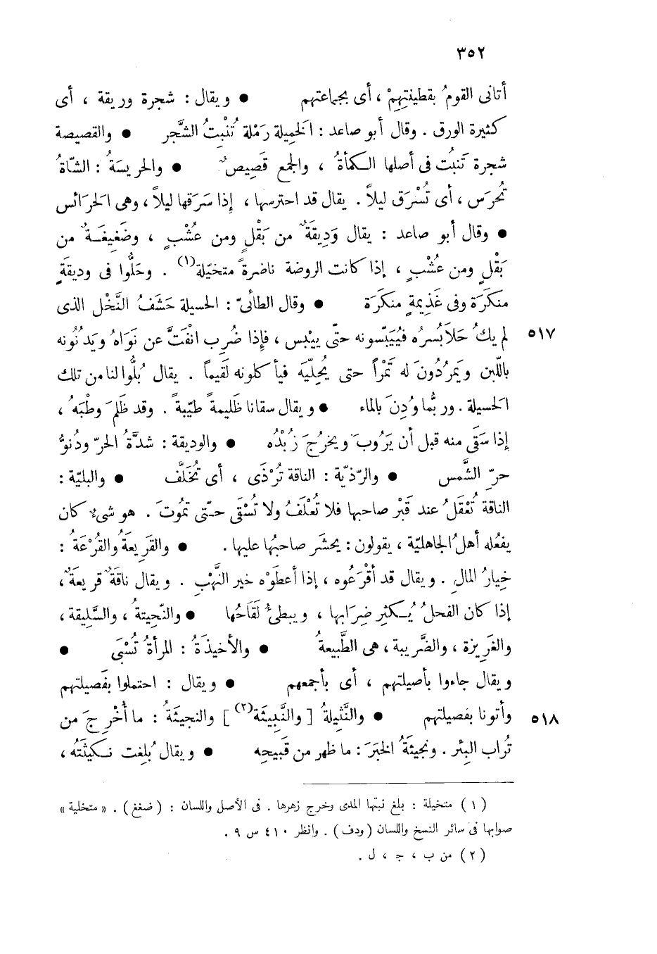 وقال أبو صاعد يقال وديقة من بقل ومن عشب وضغيغة من بقل ومن عشب إذا كانت الروضة ناضرة متخيلة وحلوا في وديقة منكرة وفي غذيمة منكرة وقال الطائي الحسيلة حشف النخل الذي لم يك حلا بسره فييبسونه حتى ييبس فإذا ضرب انفت عن نواه ويدنونه باللبن ويمردون له تمرا حتى يحليه فيأكلونه لقيما يقال بلوا لنا من تلك الحسيلة وربما ودن بالماء