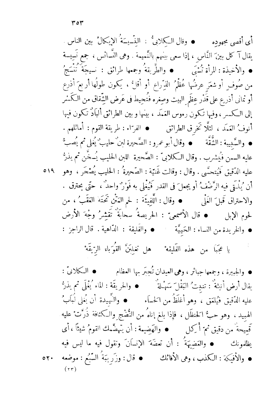 والسبيبة الشقة وقال أبو عمرو الصحيرة لبن حليب يغلى ثم يصب عليه السمن فيشرب وقال الكلابي الصحيرة اللبن الحليب يسخن ثم يذر عليه الدقيق فيتحسى وقال وقالت غنية الصحيرة الحليب يصحر وهو أن يلقى فيه الرضف أو يجعل في القدر فيغلى به فور واحد حتى يحترق والاحتراق قبل الغلي وقال اللفيئة لحم المتن تحته العقب من لحوم الإبل قال الأصمعي الحريصة سحابة تقشر وجه الأرض والخريدة من النساء الحيية والفليقة الداهية قال الراجز