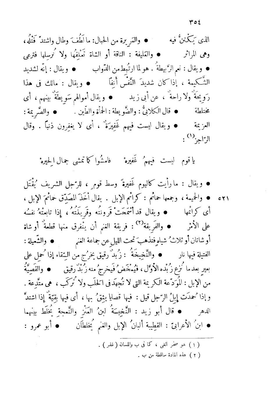 ويقال قد أسمحت قرونته وقرينته إذا تابعته نفسه على الأمر والفريقة فريقة الغنم أن ينفرق منها قطعة أو شاة أو شاتان أو ثلاث شياه فتذهب تحت الليل عن جماعة الغنم والشعيلة الفتيلة فيها نار والنخيخة زبد رقيق يخرج من السقاء إذا حمل على بعير بعد ما نزع زبده الأول فيمخض فيخرج منه زبد رقيق والقصية من الإبل المودعة الكريمة التي لا تجهد في الحلب ولا تركب هي متدعة وإذا حمدت إبل الرجل قيل فيها قصايا يثق بها أي فيها بقية إذا اشتد الدهر قال أبو زيد النخيسة لبن العنز والنعجة يخلط بينهما