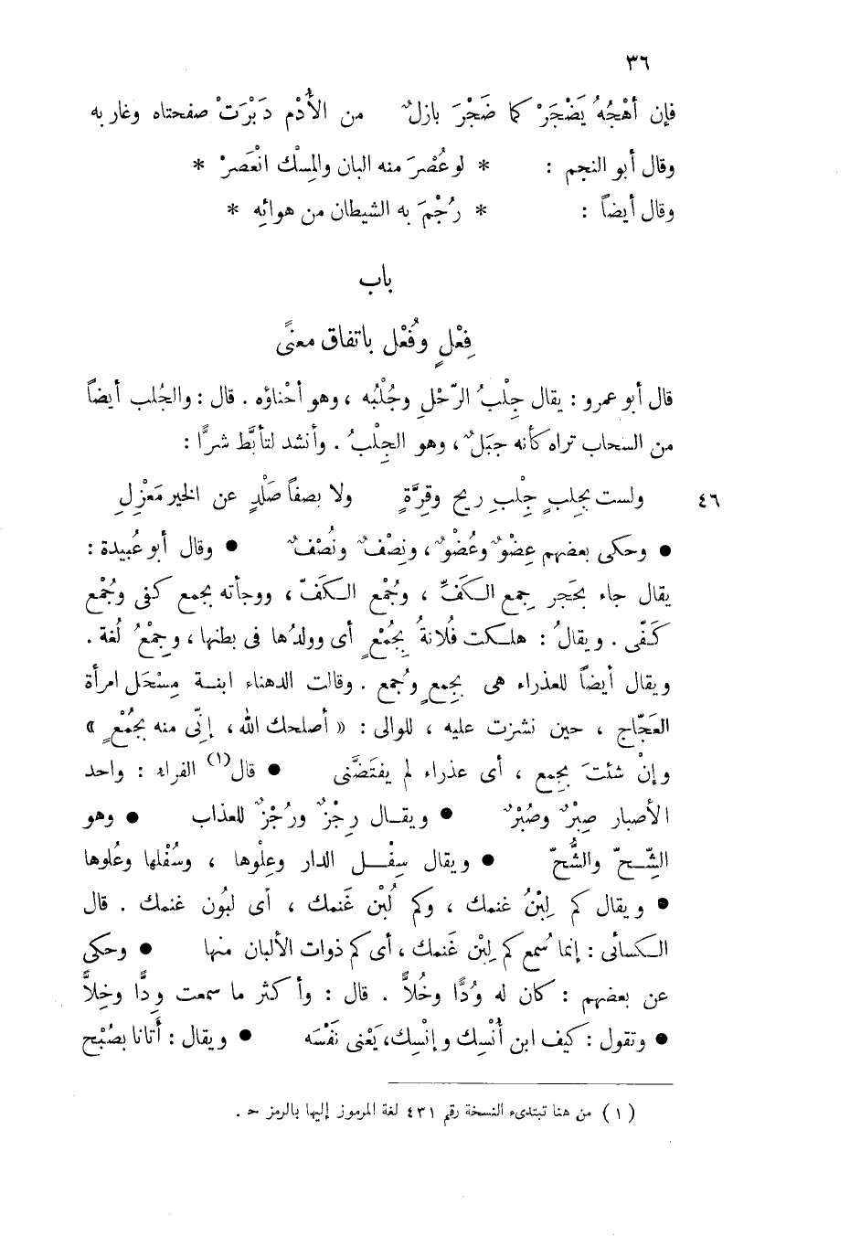 ويقال أيضا للعذراء هي بجمع وجمع وقالت الدهناء ابنة مسحل امرأة العجاج حين نشزت عليه للوالي أصلحك الله إني منه بجمع وإن شئت بجمع أي عذراء لم يفتضنى قال الفراء واحد الأصبار صبر وصبر