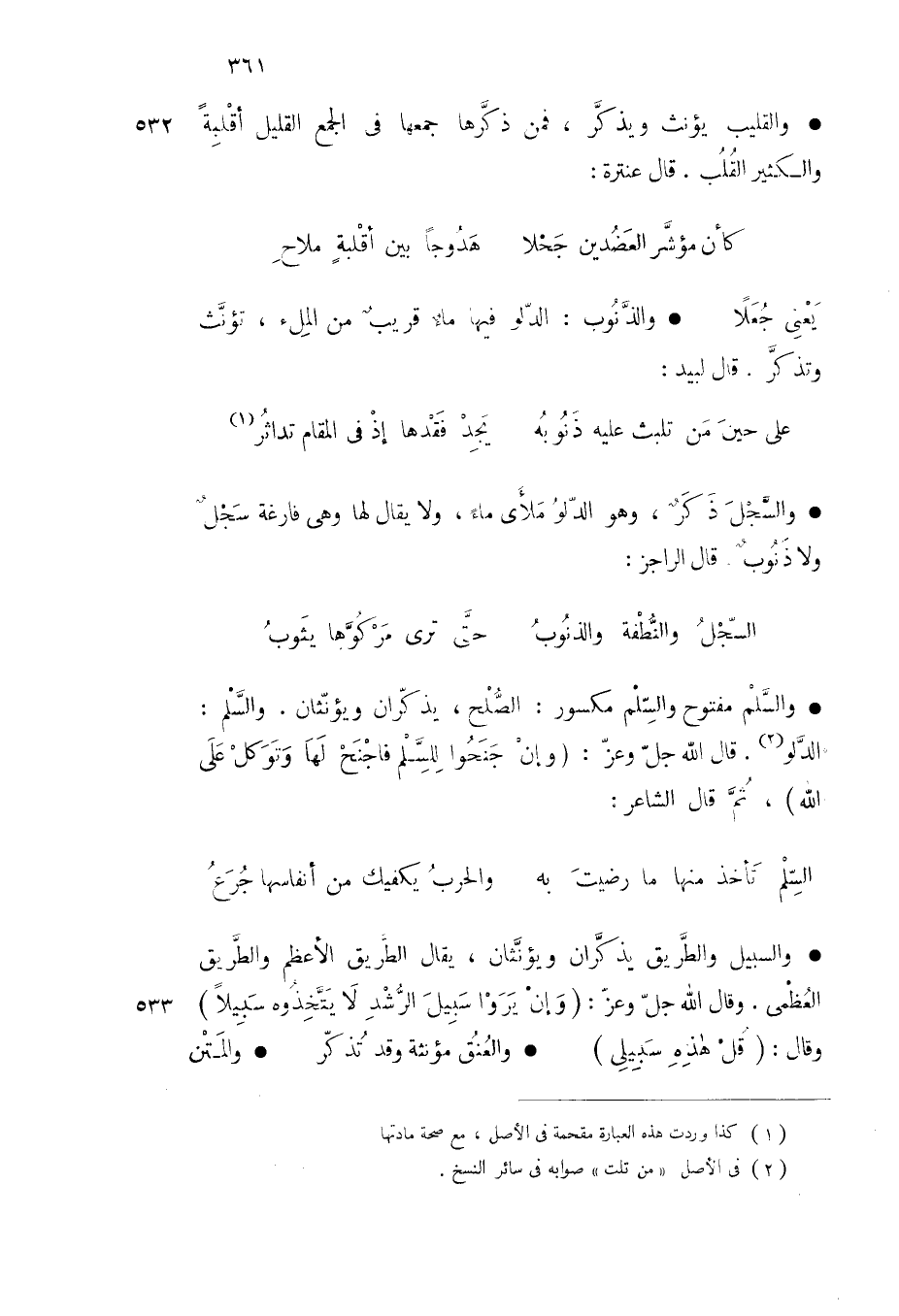 والسلم مفتوح والسلم مكسور الصلح يذكران ويؤنثان والسلم الدلو قال الله جل وعز ( وإن جنحوا للسلم فاجنح لها وتوكل على الله ) ثم قال الشاعر