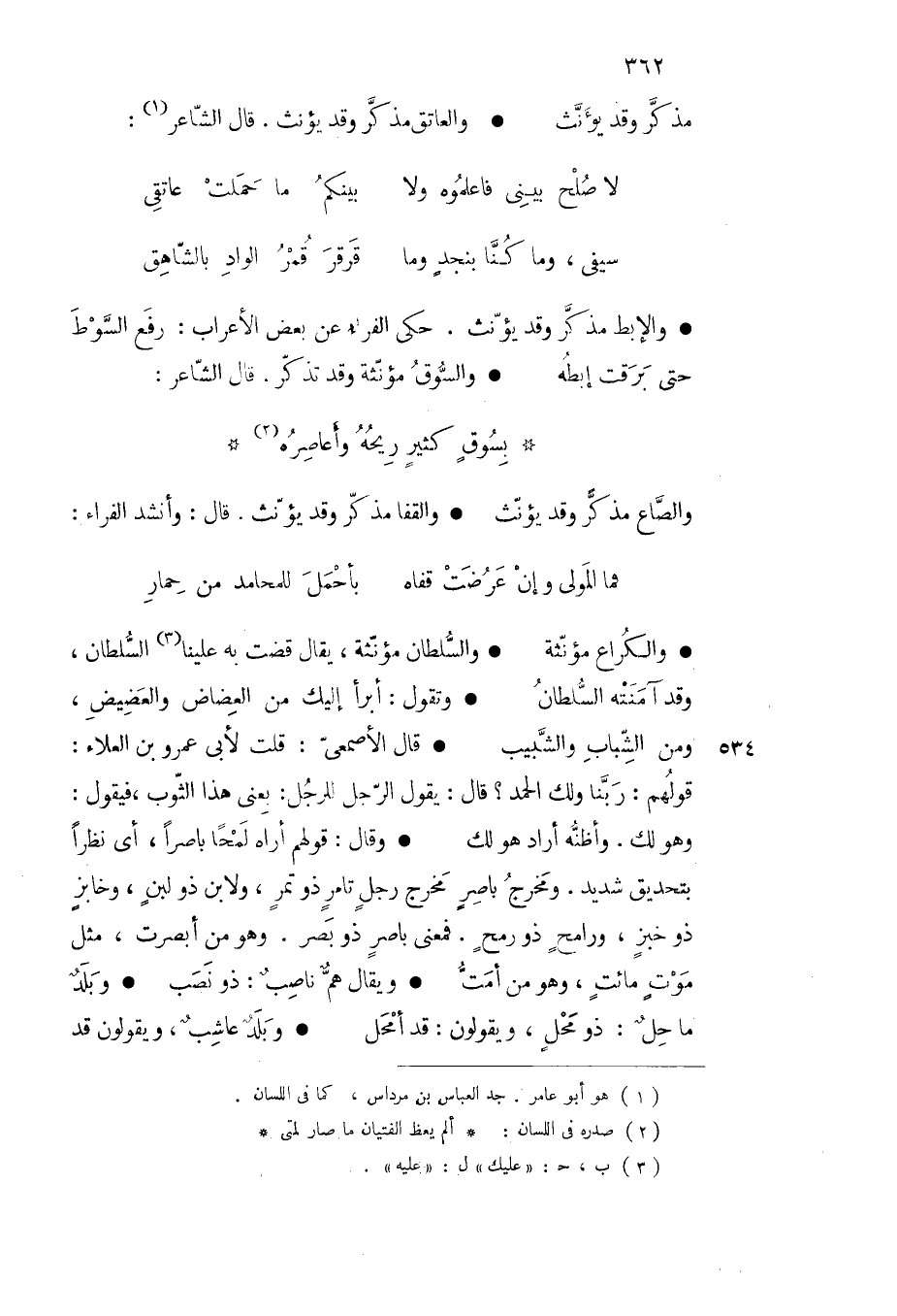 والكراع مؤنثة والسلطان مؤنثة يقال قضت به علينا السلطان وقد آمنته السلطان وتقول أبرأ إليك من العضاض والعضيض ومن الشباب والشبيب قال الأصمعي قلت لأبي عمرو بن العلاء قولهم ربنا ولك الحمد قال يقول الرجل للرجل بعني هذا الثوب فيقول وهو لك وأظنه أراد هو لك وقال قولهم أراه لمحا باصرا أي نظرا بتحديق شديد ومخرج باصر مخرج رجل تامر ذو تمر ولابن ذو لبن وخابز ذوخبز ورامح ذو رمح فمعنى باص ذو بصر وهو من أبصرت مثل موت مائت وهو من أمت