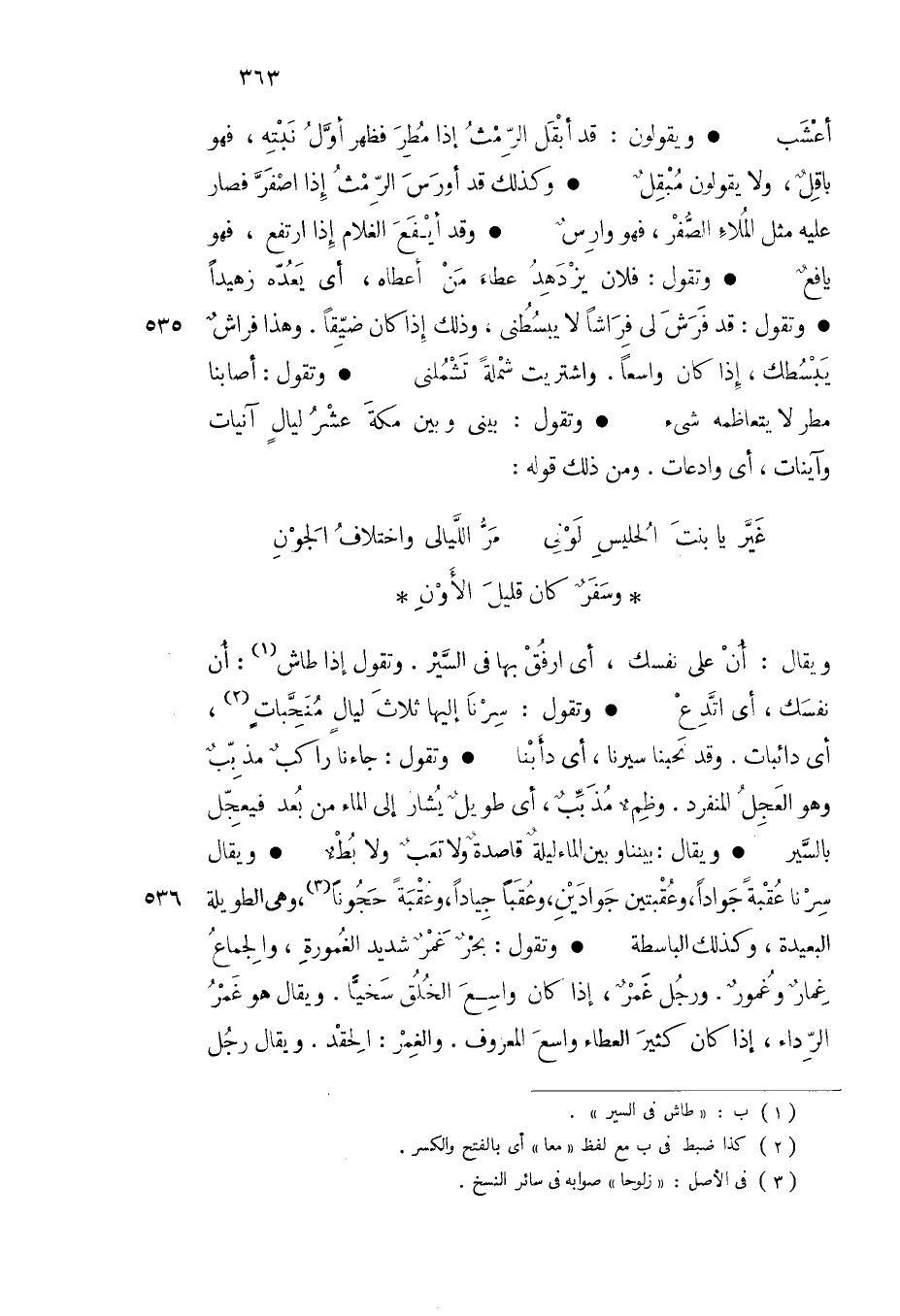 ويقال أن على نفسك أي ارفق بها في السير وتقول إذا طاش أن نفسك أي اتدع وتقول سرنا إليها ثلاث ليال منحبات أي دائبات وقد نحبنا سيرنا أي دأبنا وتقول جاءنا راكب مذبب وهو العجل المنفرد وظمء مذبب أي طويل يشار إلى الماء من بعد فيعجل بالسير
