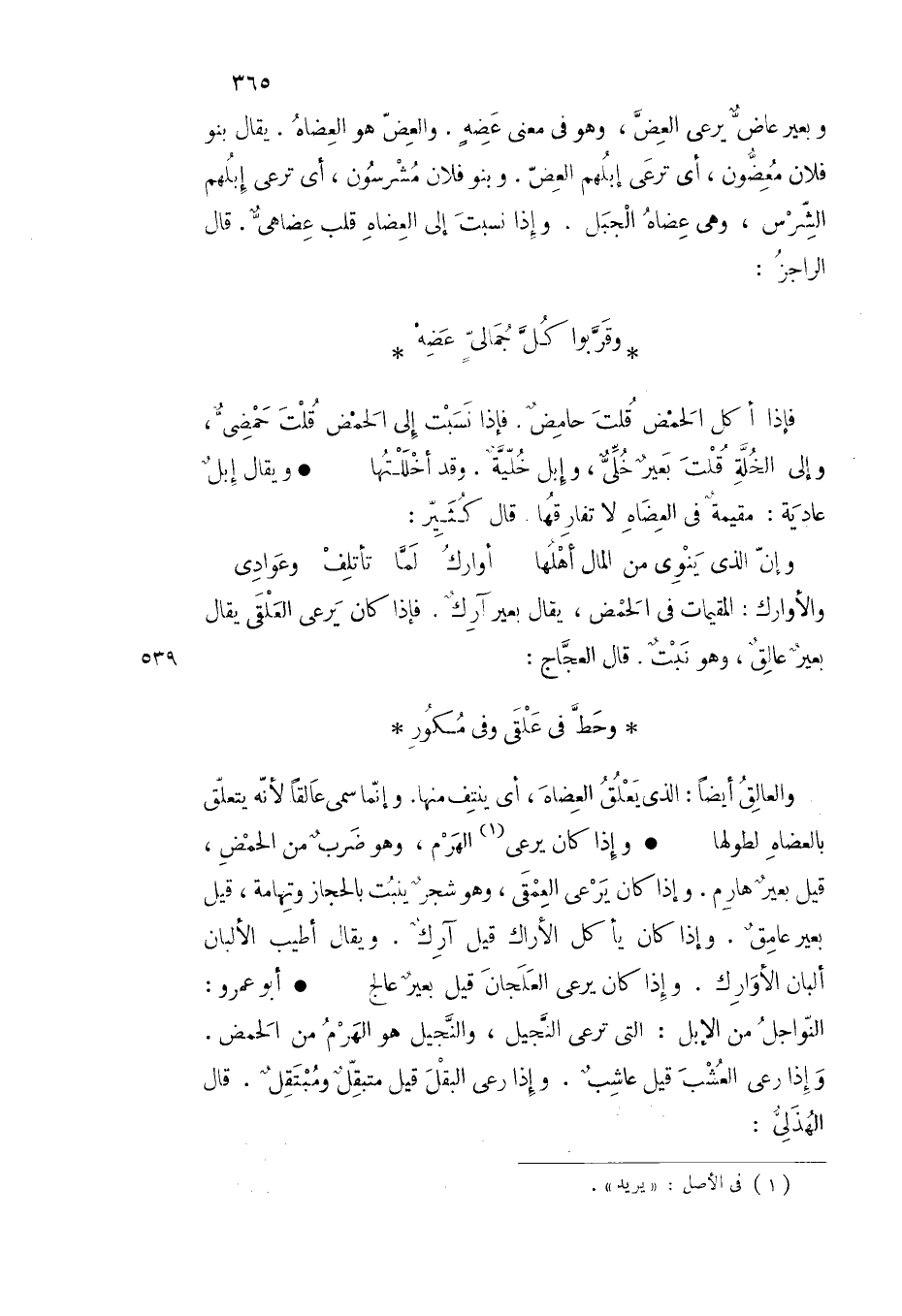 ويقال أطيب الألبان ألبان الأوارك وإذا كان يرعى العلجان قيل بعير عالج أبو عمرو النواجل من الإبل التي ترعى النجيل والنجيل هو الهرم من الحمض وإذا رعى العشب قيل عاشب وإذا رعى البقل قيل متبقل ومبتقل قال الهذلي
