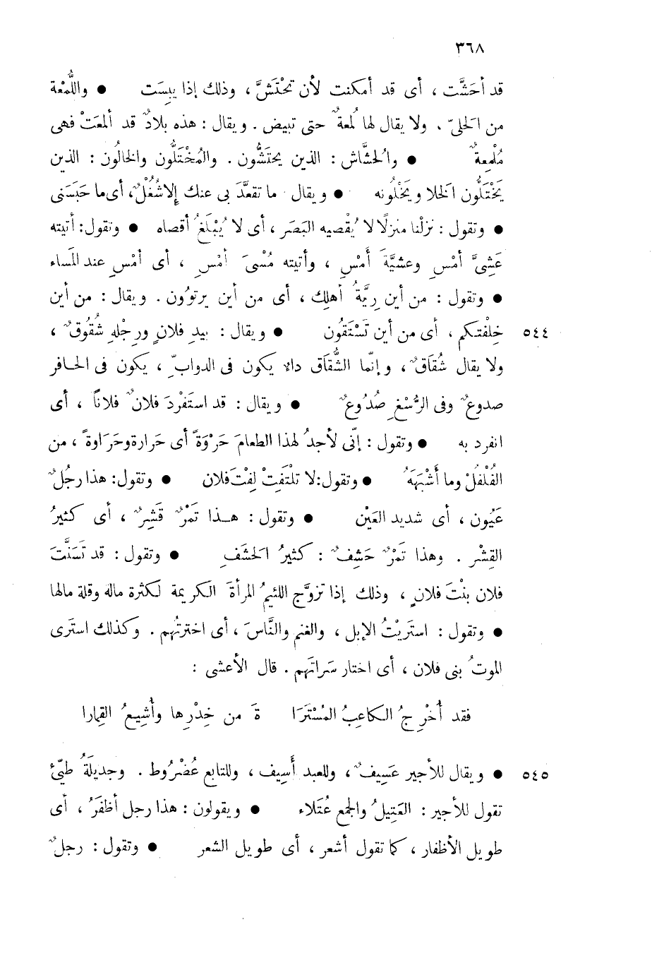 ويقال قد استفرد فلان فلانا أي انفرد به وتقول إني لأجد لهذا الطعام حروة أي حرارة وحراوة من الفلفل وما أشبهه وتقول لا تلتفت لفت فلان وتقول هذا رجل عيون أي شديد العين وتقول هذا تمر قشر أي كثير القشر وهذا تمر حشف كثير الحشف وتقول قد تسنت فلان بنت فلان وذلك إذا تزوج اللئيم المرأة الكريمة لكثرة ماله وقلة مالها