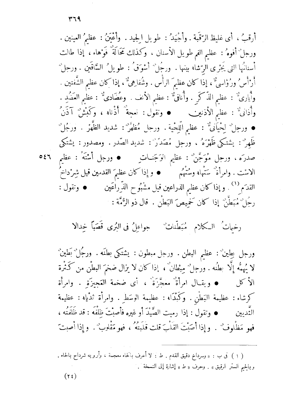 أرقب أي غليظ الرقبة وأجيد طويل الجيد وأعين عظيم العينين ورجل أفوه عظيم الفم طويل الأسنان وكذلك محالة فوهاء إذا طالت أسنانها التي يجري الرشاء بينها ورجل أسوق طويل الساقين ورجل أرأس ورؤاسي إذا كان عظيم الرأس وشفاهي إذا كان عظيم الشفتين وأياري عظيم الذكر وأنافي عظيم الأنف وعضادي عظيم العضد وأذاني عظيم الأذنين وتقول نعجة أذناء وكبش آذن ورجل لحياني عظيم اللحية ورجل مظهر شديد الظهر ورجل ظهر يشتكي ظهره ورجل مصدر شديد الصدر ومصدور يشتكي صدره ورجل موجن عظيم الوجنات ورجل أسته عظيم الاست وامرأة ستهاء وستهم وإذا كان عظيم القدمين قيل شرواخ القدم وإذا كان عظيم الذراعين قيل مشبوح الذراعين وتقول رجل مبطن إذا كان خميص البطن قال ذو الرمة