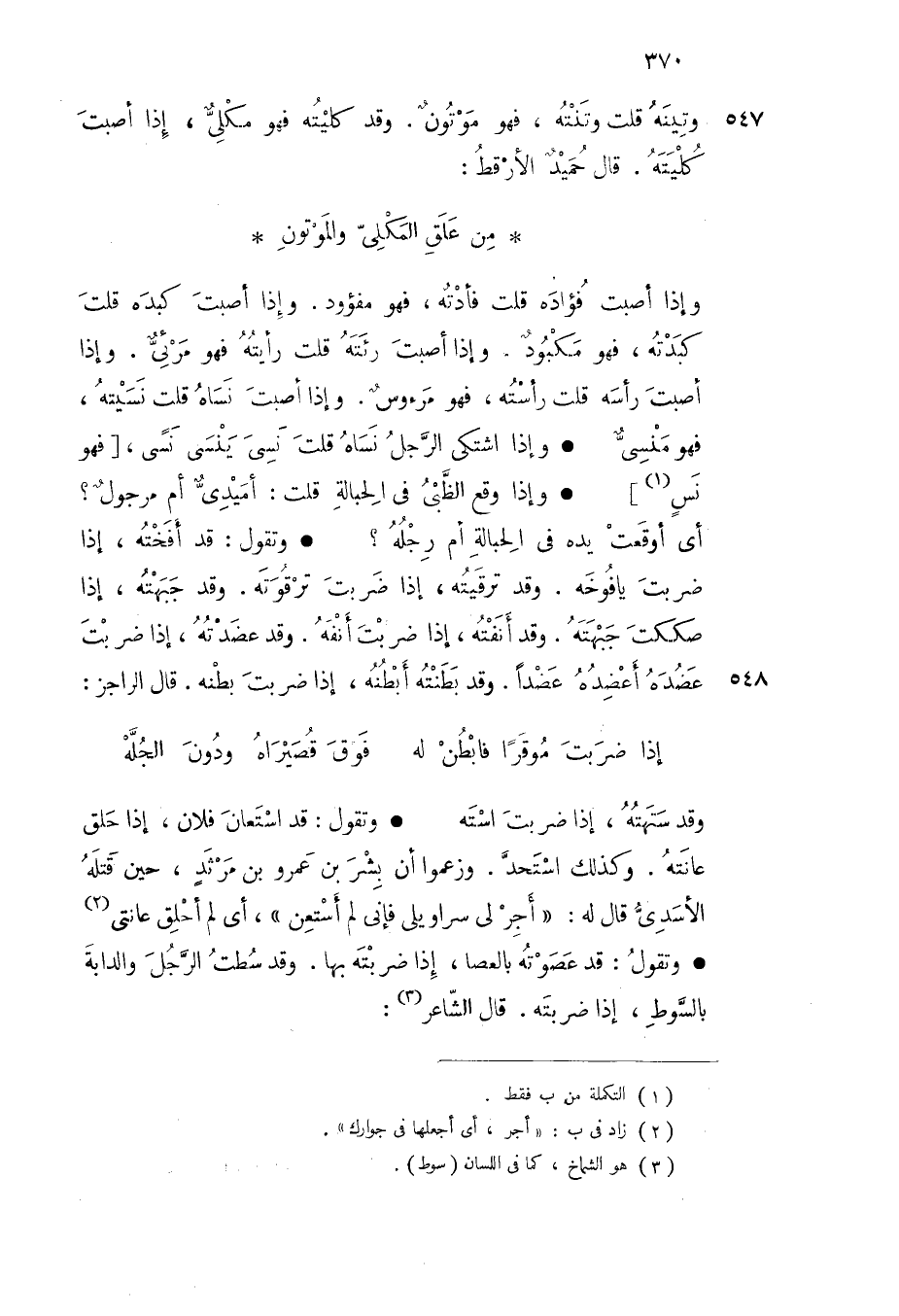 وإذا أصبت فؤاده قلت فأدته فهو مفؤود وإذا أصبت كبده قلت كبدته فهو مكبود وإذا أصبت رئته قلت رأيته فهو مرئي وإذا أصبت رأسه قلت رأسته فهو مرءوس وإذا أصبت نساه قلت نسيته فهو منسي وإذا اشتكى الرجل نساه قلت نسي ينسي نسى فهو نس وإذا وقع الظبي في الحبالة قلت أميدي أم مرجول أي أوقعت يده في الحبالة أم رجله وتقول قد أفخته إذا ضربت يافوخه وقد ترقيته إذا ضربت ترقوته وقد جبهته إذا صككت جبهته وقد أنفته إذا ضربت أنفه وقد عضدته إذا ضربت عضده أعضده عضدا وقد بطنته أبطنه إذا ضربت بطنه قال الراجز