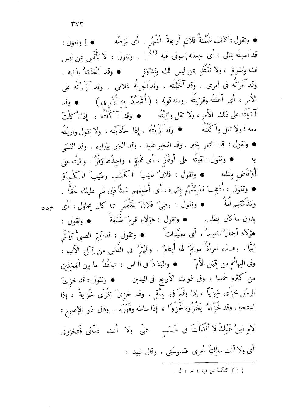 وتقول كانت ضمنة فلان أربعة أشهر أي مرضه وتقول قد آسيته بمالي أي جعلته إسوتى فيه وتقول لا تأتس بمن ليس لك بإسوة ولا تقتد بمن ليس لك بقدوة وقد آخذته بذنبه وقد آمرته في أمري وقد آخيته وقد آجرته غلامي وقد آزرته على الأمر أي أعنته وقويته ومنه قوله ( اشدد به أزري ) وقد آتيته على ذلك الأمر ولا تقل واتيته وقد آكلته إذا أكلت معه ولا تقل واكلته وقد آزيته إذا حاذيته ولا تقول وازيته وتقول قد ائتمر بخير وقد ائتجر عليه وقد ائتزر بإزاره وقد ائتسى به وتقول لقيته على أوفاز أي عجلة واحدها وفز ولقيته على أوفاض مثلها وتقول فلان طيب الكسب وطيب المكسبة وتقول أذهب مذمتهم بشيء أي أطعمهم شيئا فإن لهم عليك حقا ومذمتهم لغة وتقول رضى فلان بمقصر مما كان يحاول أي بدون ما كان يطلب وتقول هؤلاء قوم ضعفة وتقول هؤلاء أجمال مقاييد أي مقيدات وتقول قد يتم الصبي ييتم يتما وهذه امرأة موتم لها أيتام واليتم في الناس من قبل الأب وفي البهائم من قبل الأم والبدد في الناس تباعد ما بين الفخذين من كثرة لحمهما وفي ذوات الأربع في اليدين وتقول قد خزي الرجل يخزى خزيا إذا وقع في بلية وقد خزي يخزي خزاية إذا استحيا وقد خزاه يخزوه خزوا إذا ساسه وقهره وقال ذو الإصبع ( لاه ابن عمك لا أفضلت في حسب ... عني ولا أنت دياني فتخزوني )