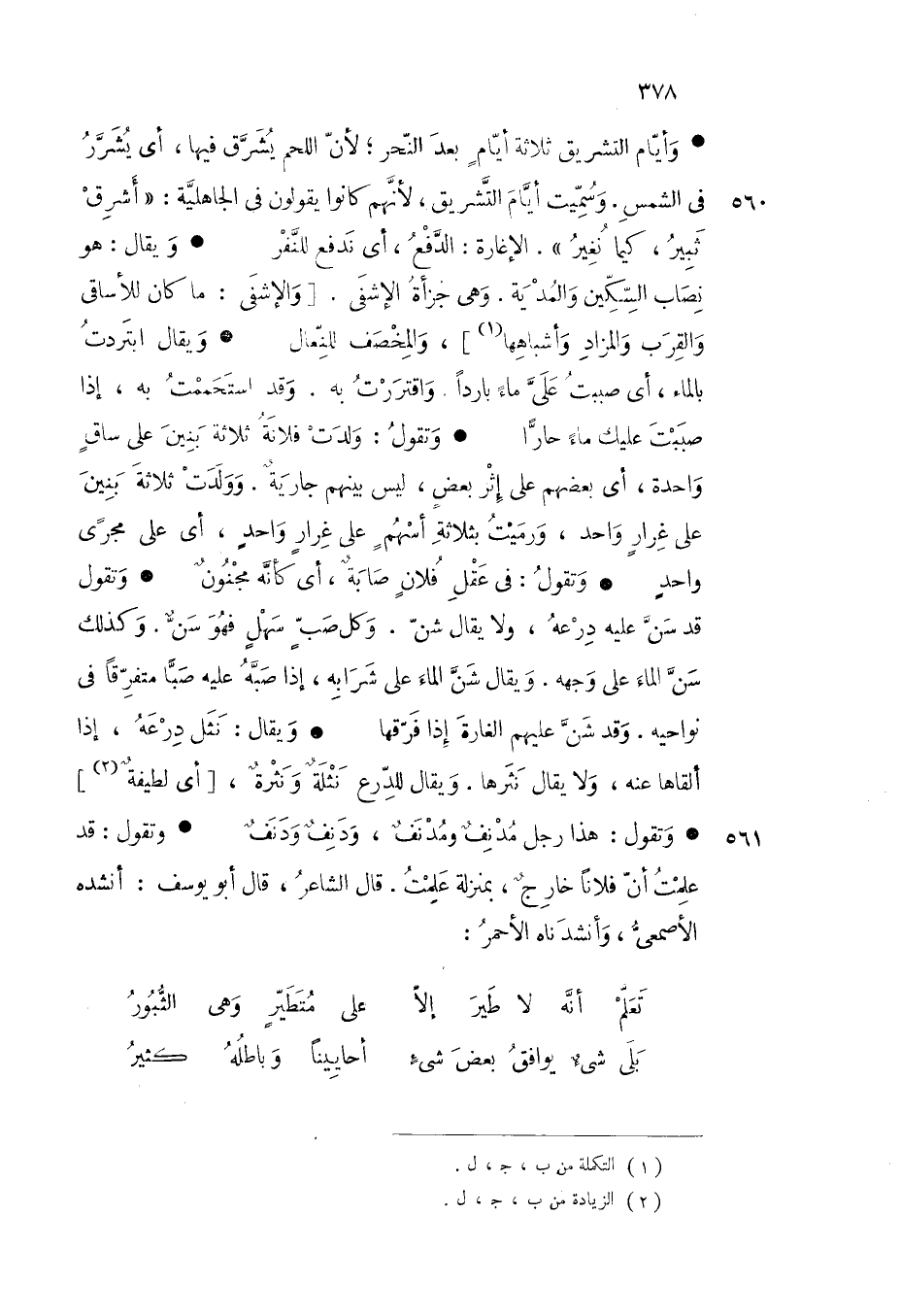ويقال ابتردت بالماء أي صببت علي ماء باردا واقتررت به وقد استحممت به إذا صببت عليك ماء حارا وتقول ولدت فلانة ثلاثة بنين على ساق واحدة أي بعضهم على إثر بعض ليس بينهم جارية وولدت ثلاثة بنين على غرار واحد ورميت بثلاثة أسهم على غرار واحد أي على مجرى واحد وتقول في عقل فلان صابة أي كأنه مجنون وتقول قد سن عليه درعه ولا يقال شن وكل صب سهل فهو سن وكذلك سن الماء على وجهه