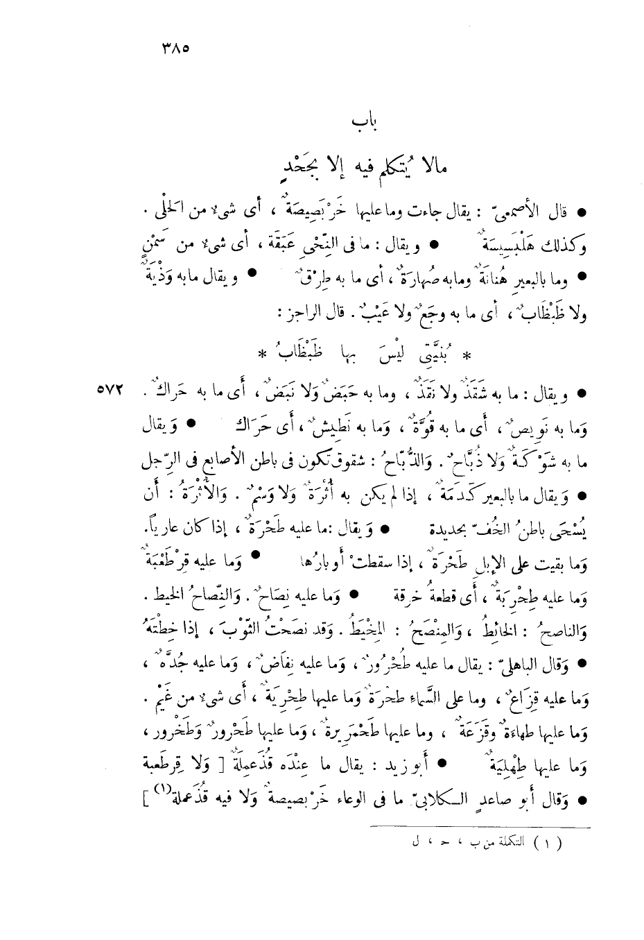 ويقال ما عليه طحرة إذا كان عاريا وما بقيت على الإبل طحرة إذا سقطت أوبارها وما عليه قرطعبة وما عليه طحربة أي قطعة خرقة وما عليه نصاح والنصاح الخيط والناصح الخائط والمنصح المخيط وقد نصحت الثوب إذا خطته وقال الباهلي يقال ما عليه طحرور وما عليه نفاض وما عليه جده وما عليه قزاع وما على السماء طحرة وما عليها طحرية أي شيء من غيم وما عليها طهاءة وقزعة وما عليها طحمريرة وما عليها طحرور وطخرور وما عليها طهلية أبو زيد يقال ما عنده قذ عملة ولا قر طعبة وقال أبو صاعد الكلابي ما في الوعاء خربصيصة ولا فيه قذ عملة