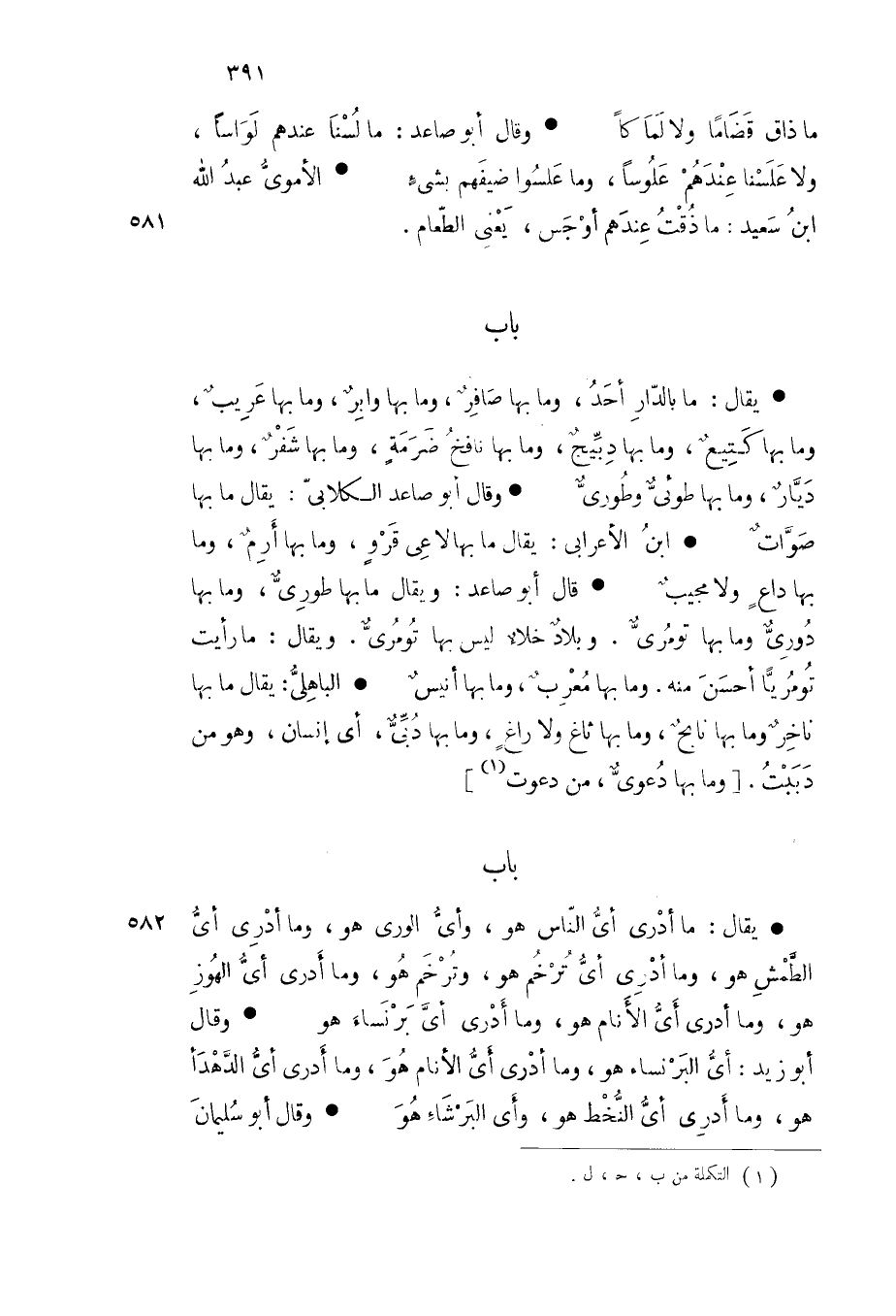 ويقال ما رأيت تومريا أحسن منه وما بها معرب وما بها أنيس الباهلي يقال ما بها ناخر وما بها نابح وما بها ثاغ ولا راغ وما بها دبي أي إنسان وهو من دببت وما بها دعوى من دعوت باب