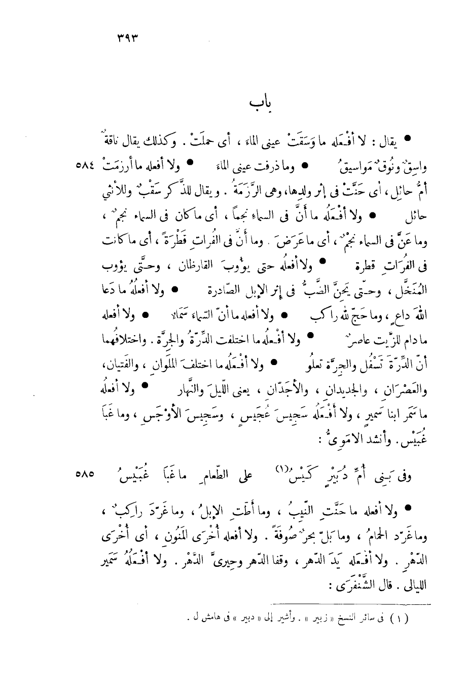 ولا أفعله ما حنت النيب وما أطت الإبل وما غرد راكب وما غرد الحمام وما بل بحر صوفة ولا أفعله أخرى المنون أي أخرى الدهر ولا أفعله يد الدهر وقفا الدهر وحيري الدهر ولا أفعله سمير الليالي قال الشنفرى