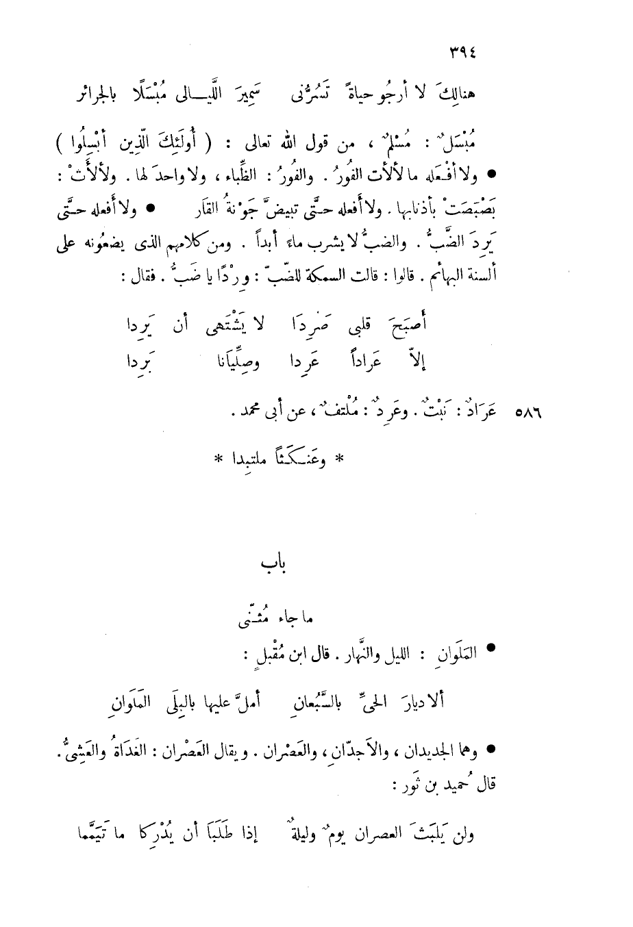 مبسل مسلم من قول الله تعالى ( أولئك الذين أبسلوا ) ولا أفعله ما لألأت الفور والفور الظباء ولا واحد لها ولألأت بصبصت بأذنابها ولا أفعله حتى تبيض جونة القار ولا أفعله حتى يرد الضب والضب لا يشرب ماء أبدا ومن كلامهم الذي يضعونه على ألسنة البهائم قالوا قالت السمكة للضب وردا يا ضب فقال