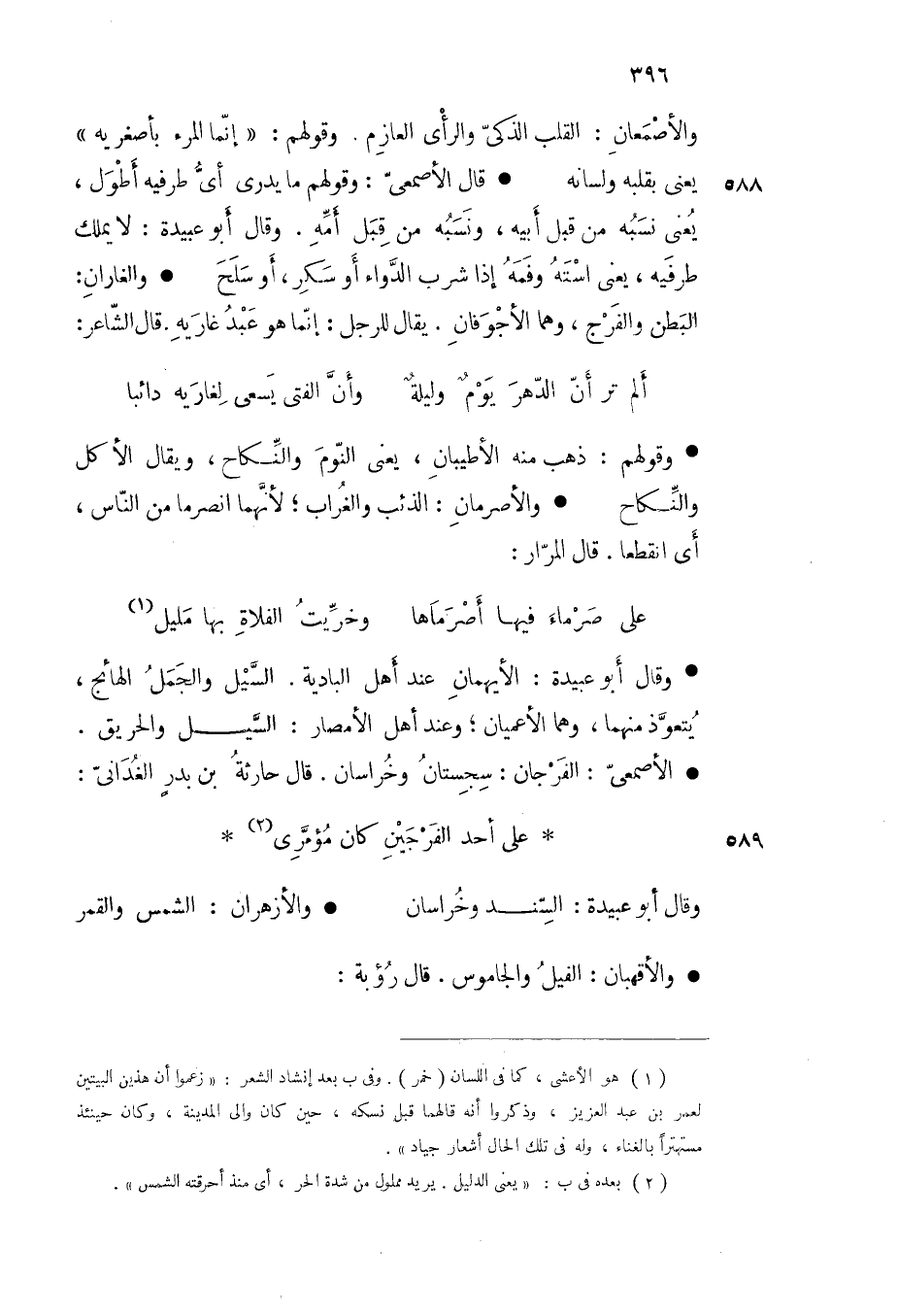 والأصمعان القلب الذكي والرأي العازم وقولهم إنما المرء بأصغريه يعني بقلبه ولسانه قال الأصمعي وقولهم ما يدري أي طرفيه أطول يعني نسبه من قبل أبيه ونسبه من قبل أمه وقال أبو عبيدة لا يملك طرفيه يعني استه وفمه إذا شرب الدواء أو سكر أو سلح والغاران البطن والفرج وهما الأجوفان يقال للرجل إنما هو عبد غاريه قال الشاعر